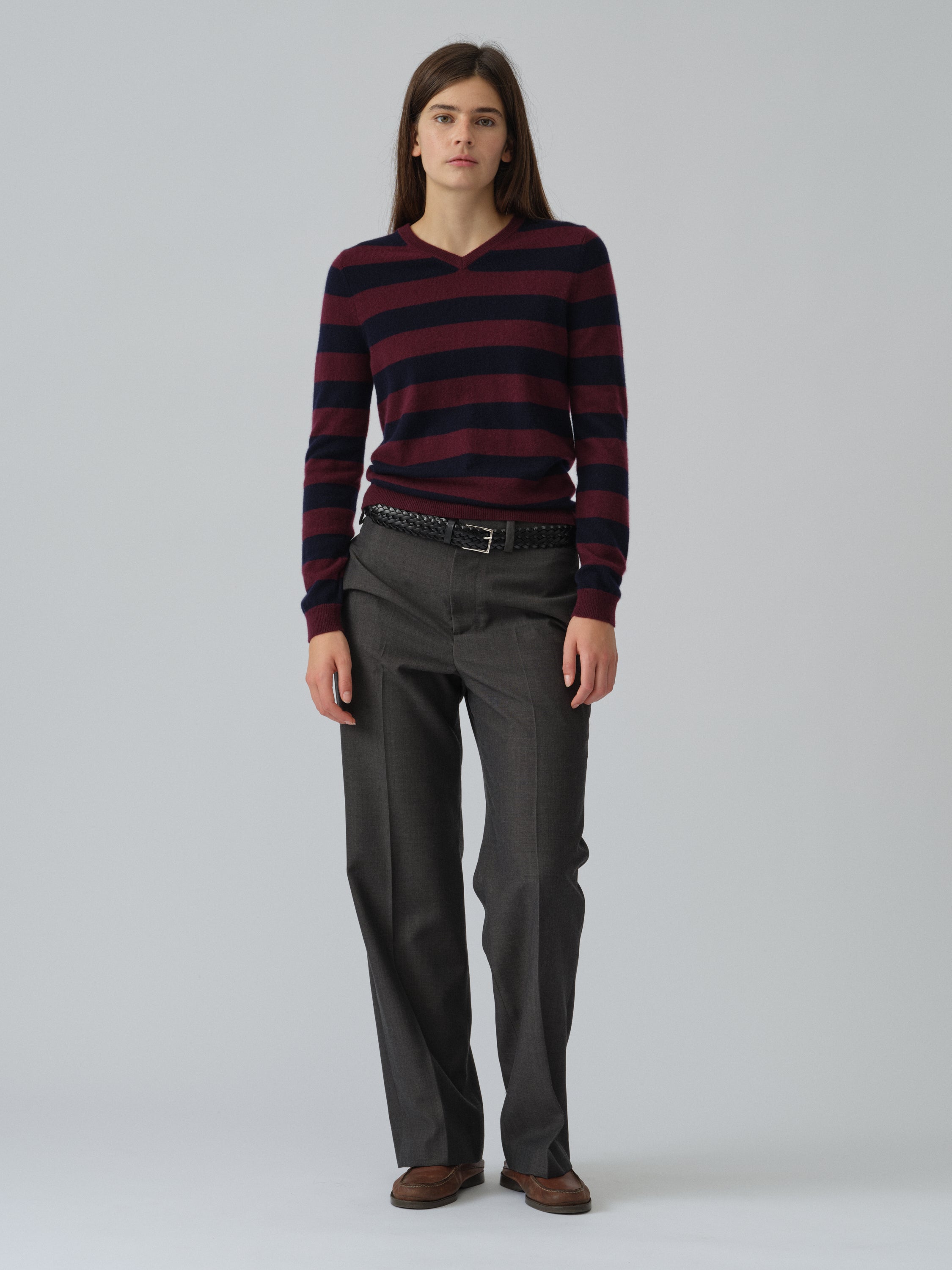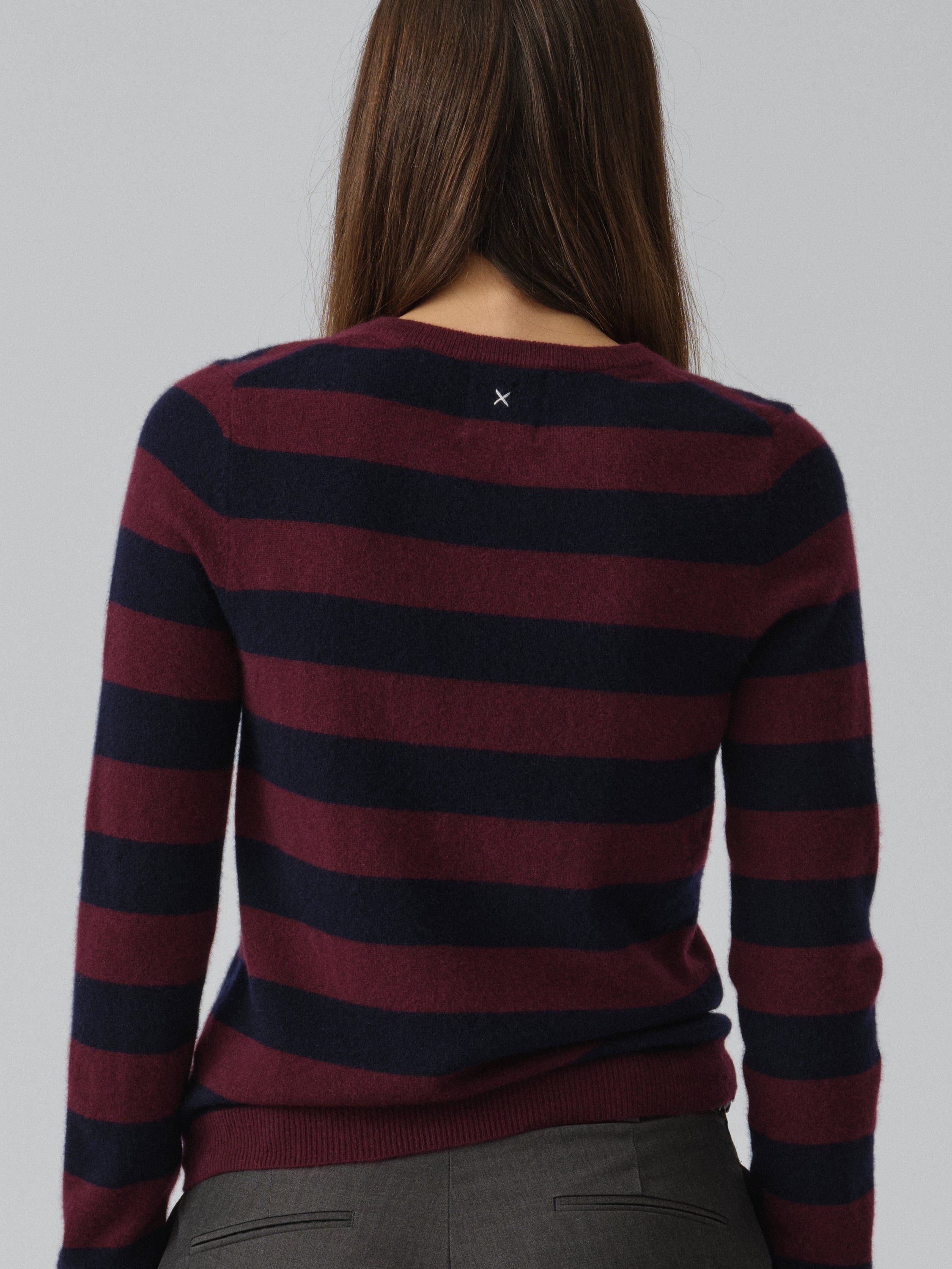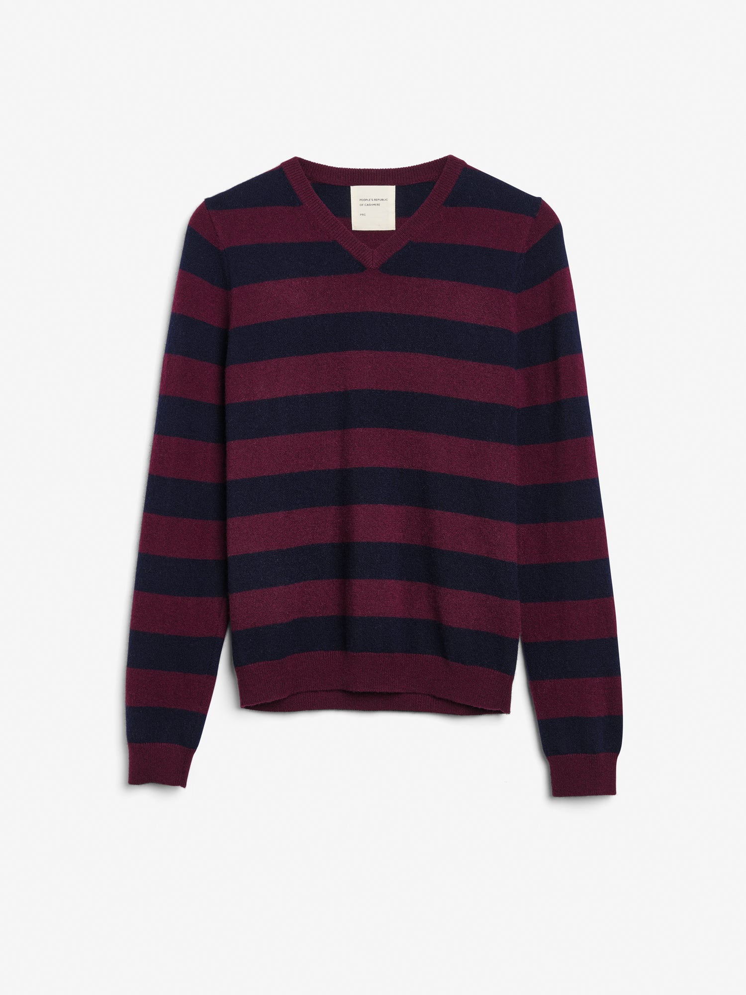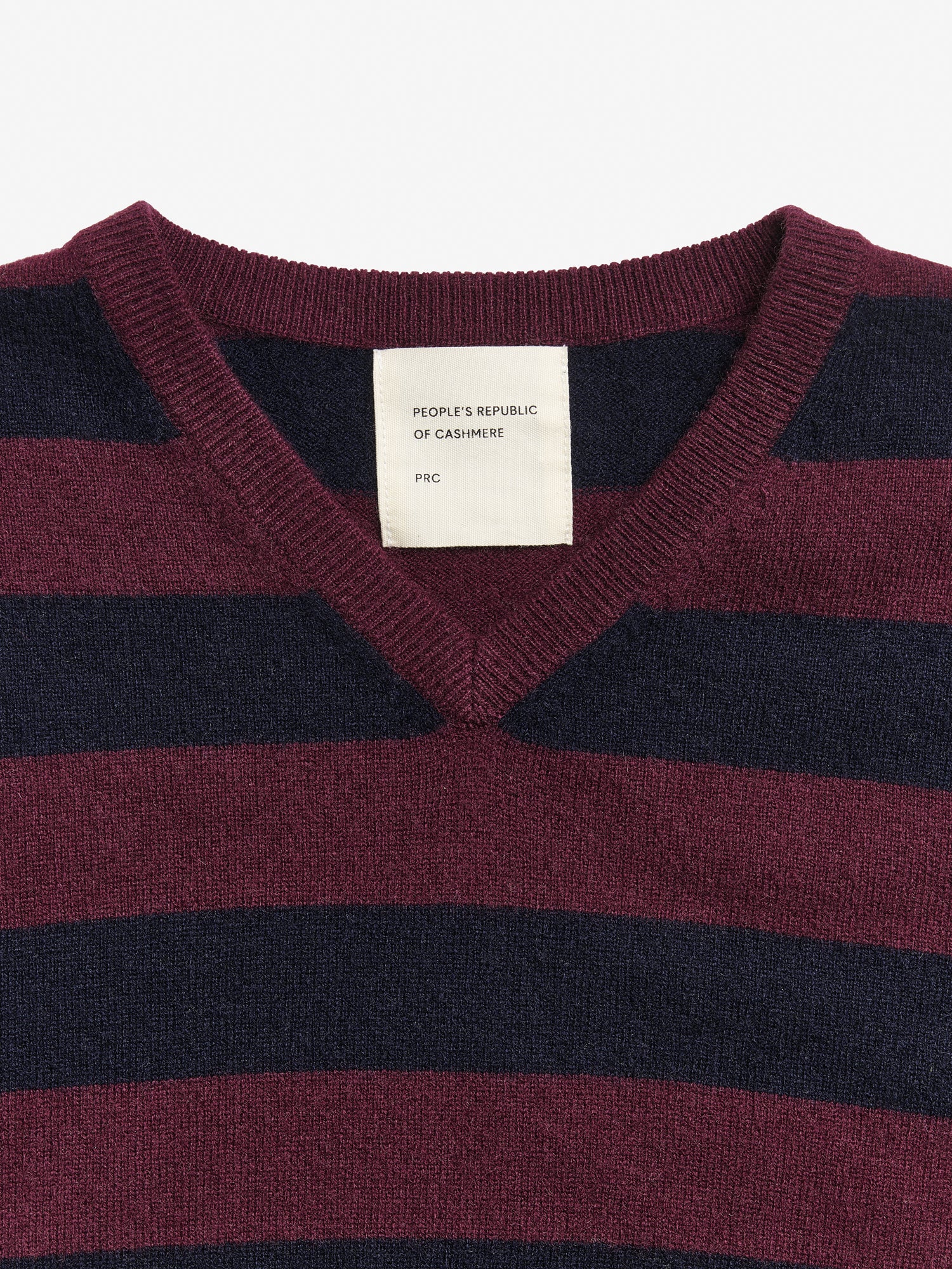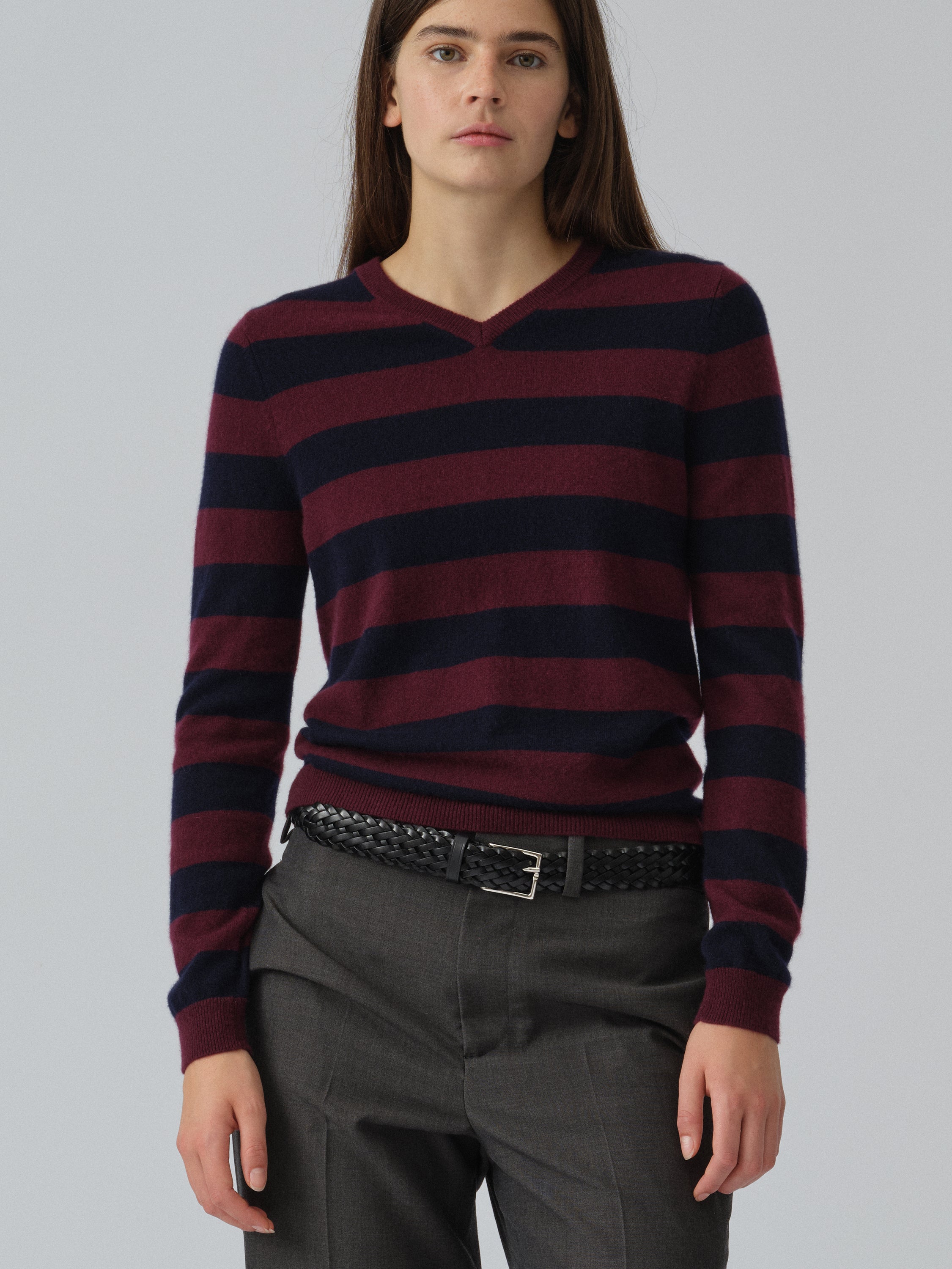 Crafted from 100% Grade A cashmere in a 12-gauge knit, the Women's Fitted 90s V-Neck in Navy Blue and Bordeaux features bold, wide stripes, a clean V-neckline, and a softly contoured silhouette that flatters without feeling tight. Inspired by 90s minimalism, it brings a modern edge to a timeless shape. Perfect for layering or wearing on its own, it’s a versatile piece designed for effortless, everyday elegance.