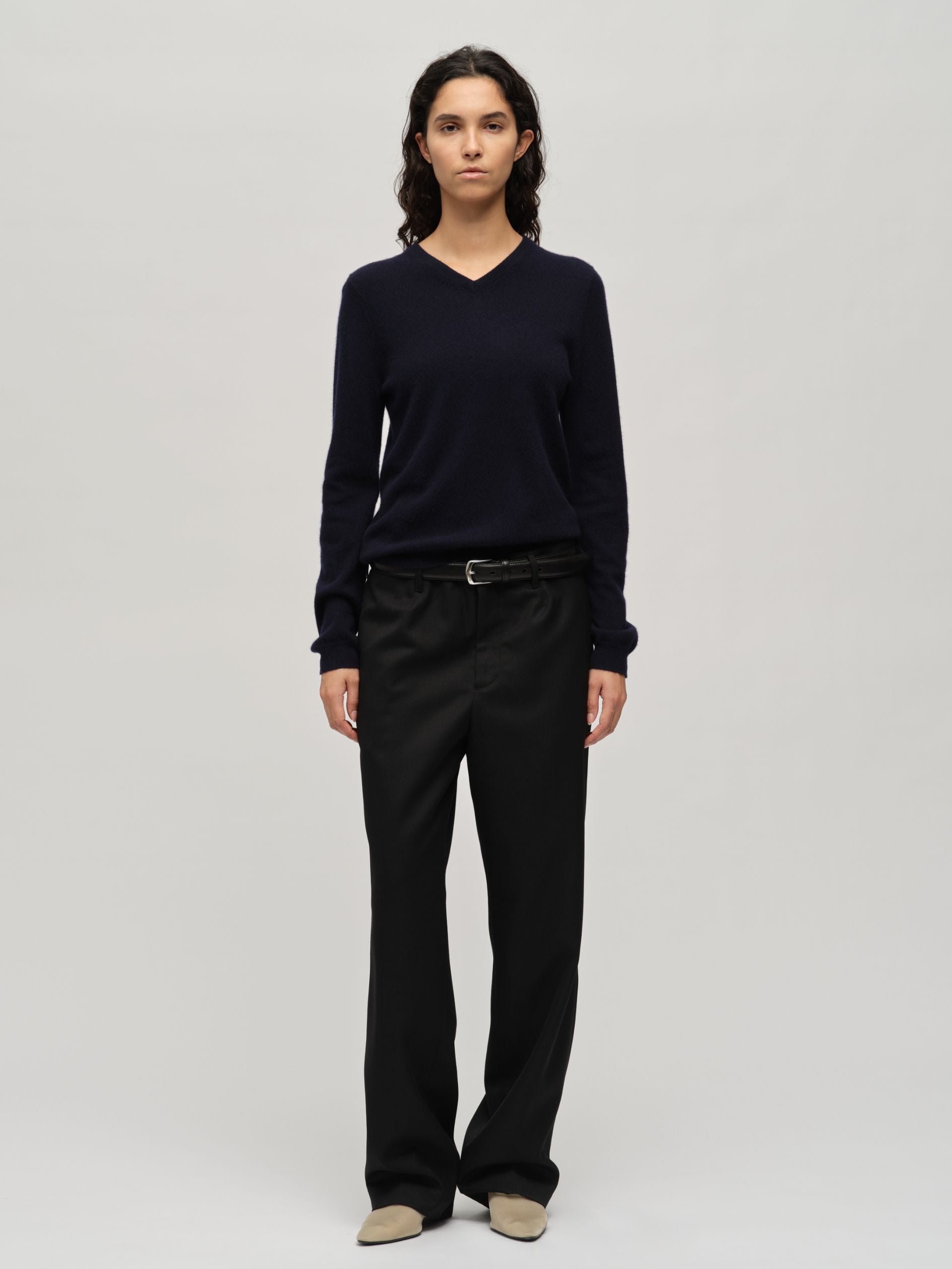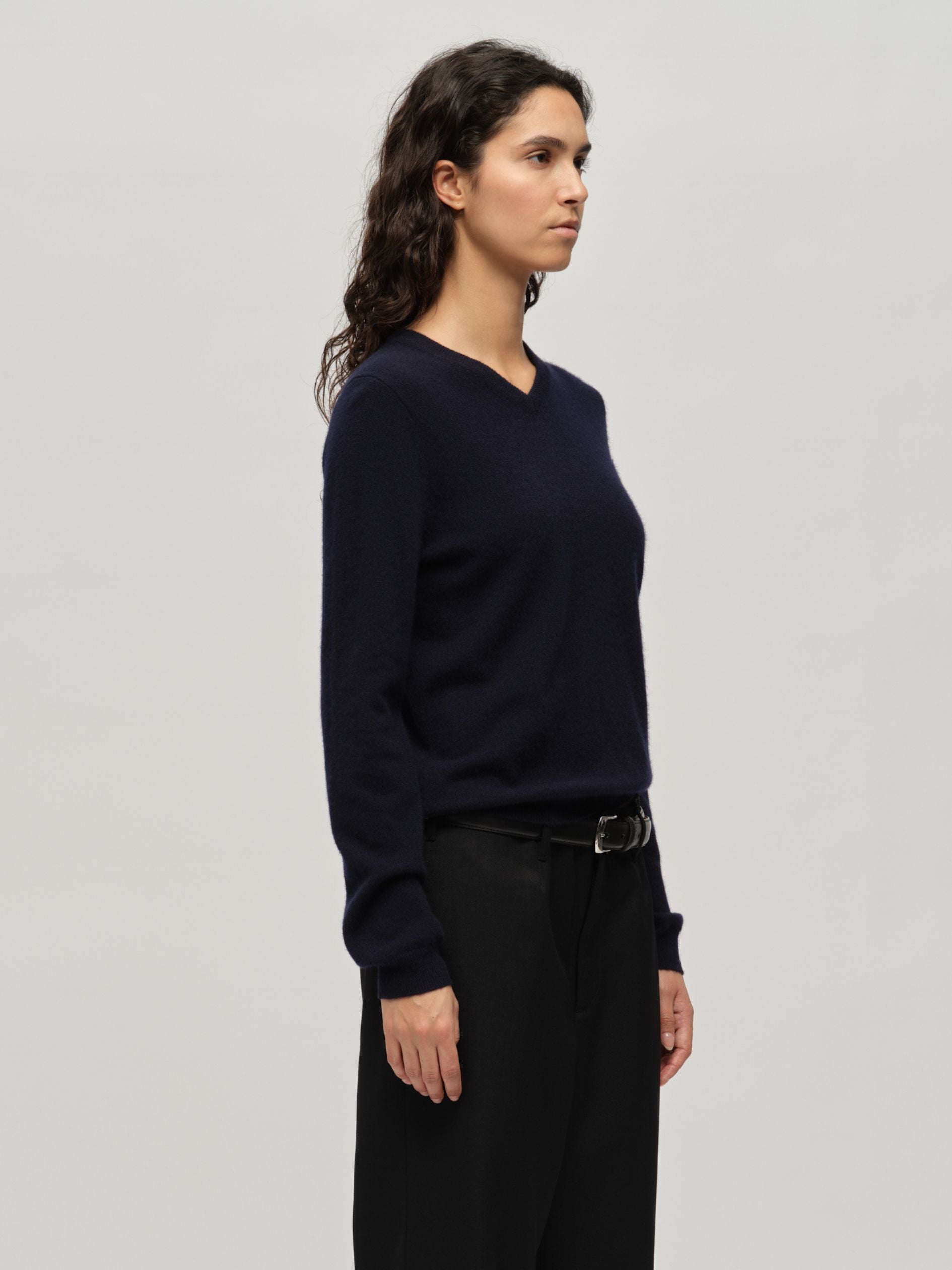 Crafted from 100% Grade A cashmere in a 12-gauge knit, the Women's Fitted 90s V-Neck in Navy Blue features a clean V-neckline and a softly contoured silhouette that flatters without feeling tight. Inspired by 90s minimalism, it brings a modern edge to a timeless shape, perfect for layering or wearing on its own. A versatile piece designed for effortless, everyday elegance.