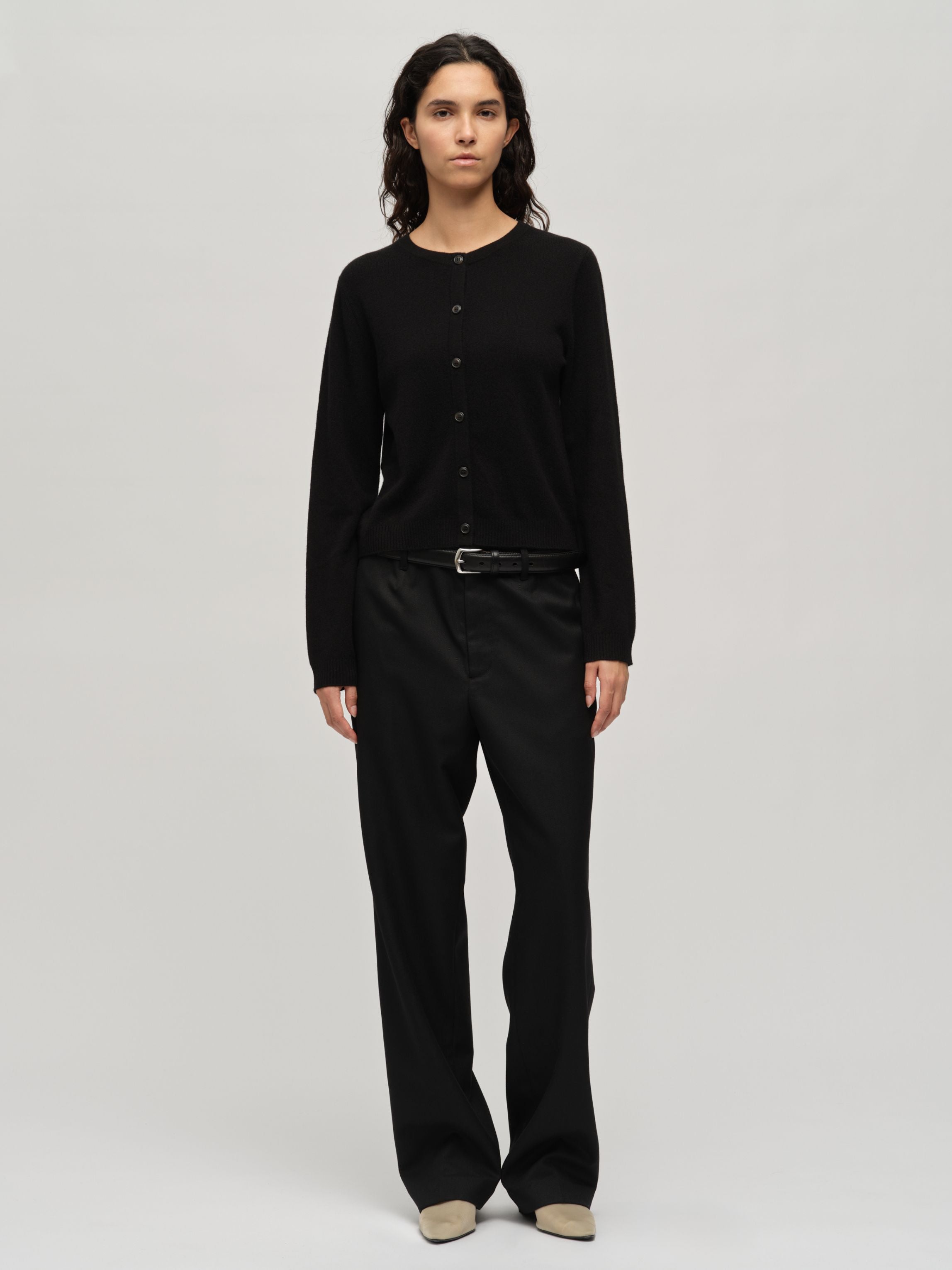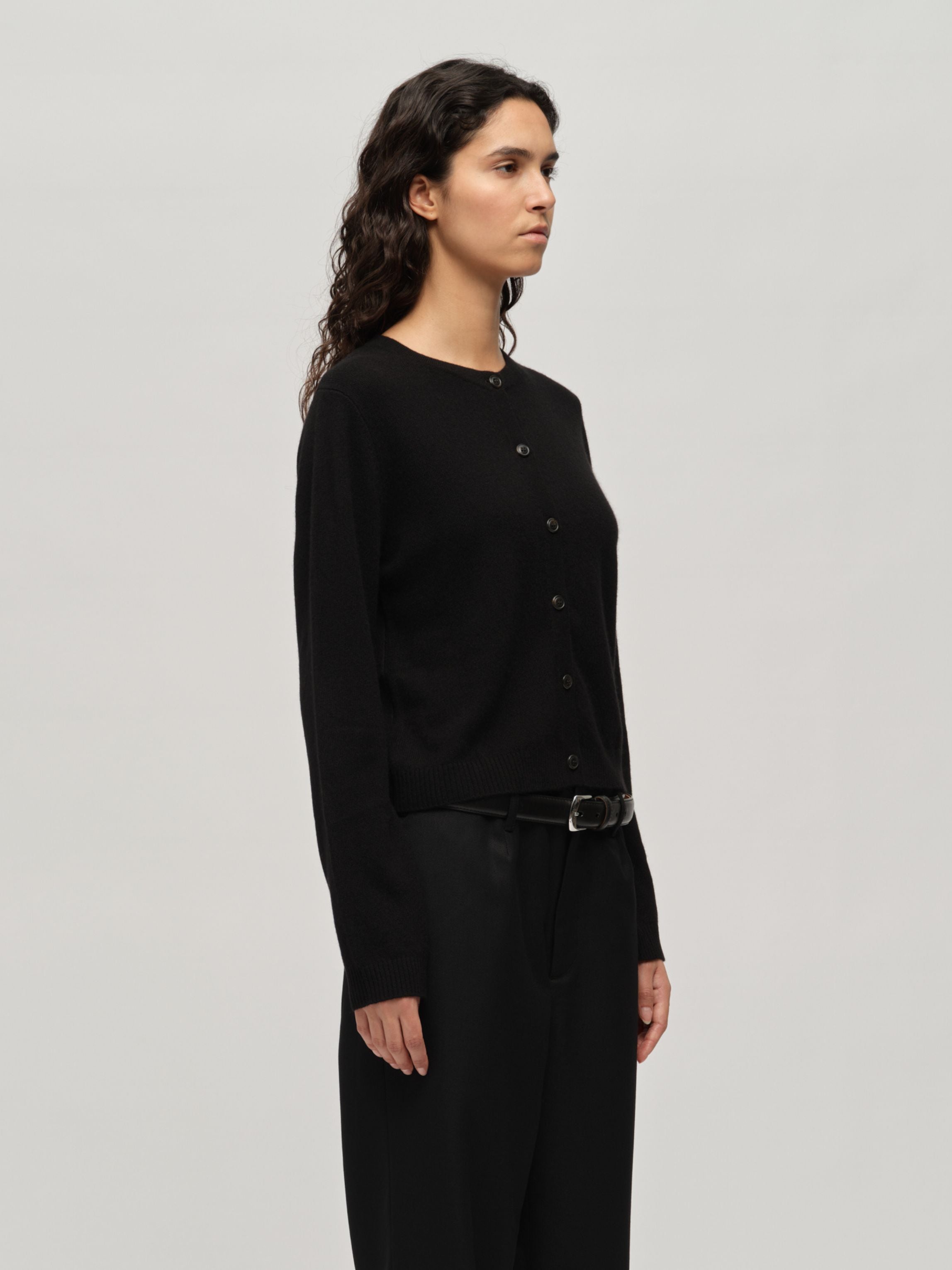 Crafted from 100% Grade A Inner Mongolian cashmere in a 12-gauge knit, the Women's O-Cardigan in Black is a timeless wardrobe essential. This classic, fitted cardigan features a neat round neckline and a flattering silhouette that combines comfort with understated luxury. Expertly knitted to resist pilling and maintain its shape, it is a versatile piece designed to be worn and cherished season after season.