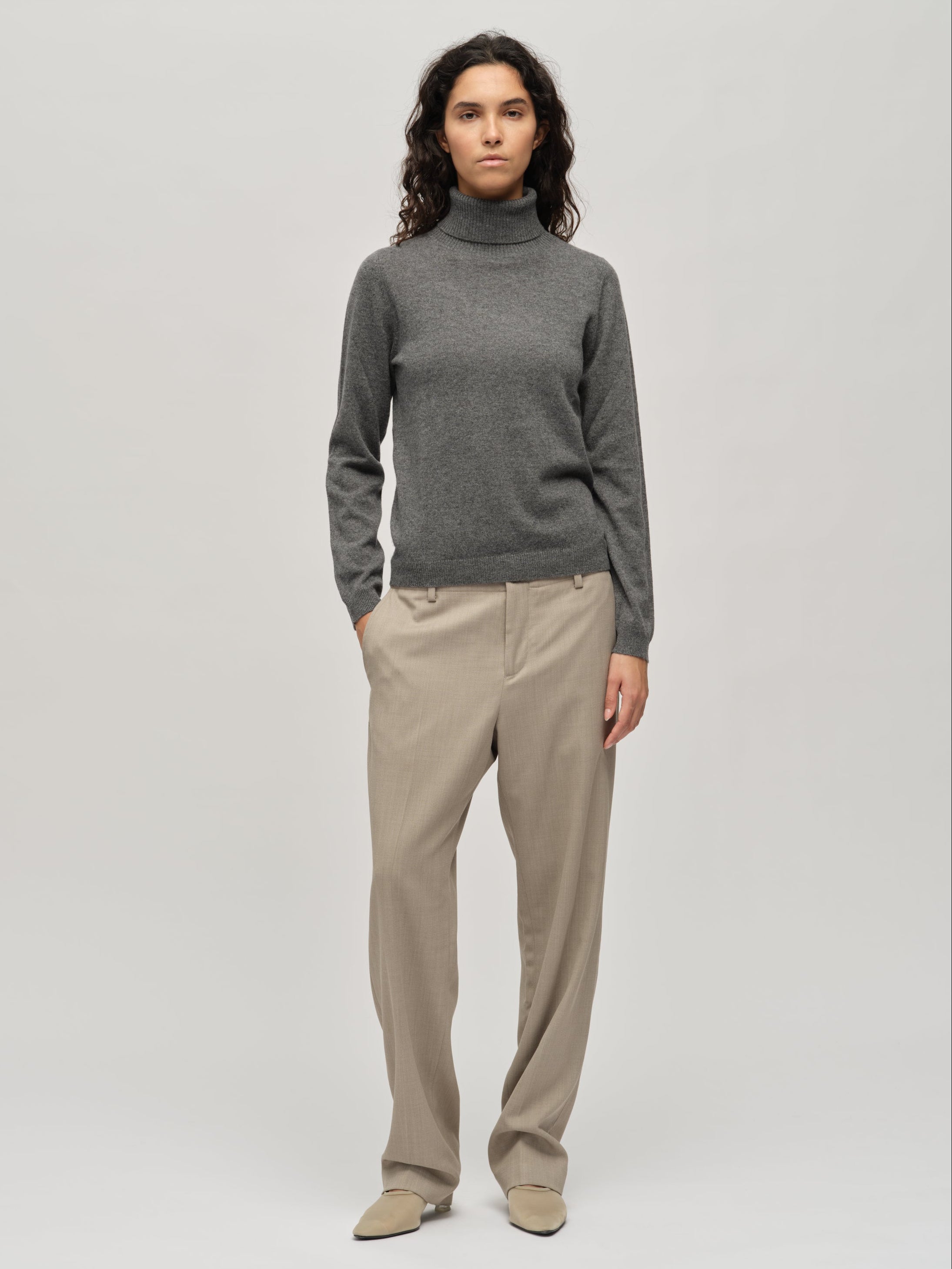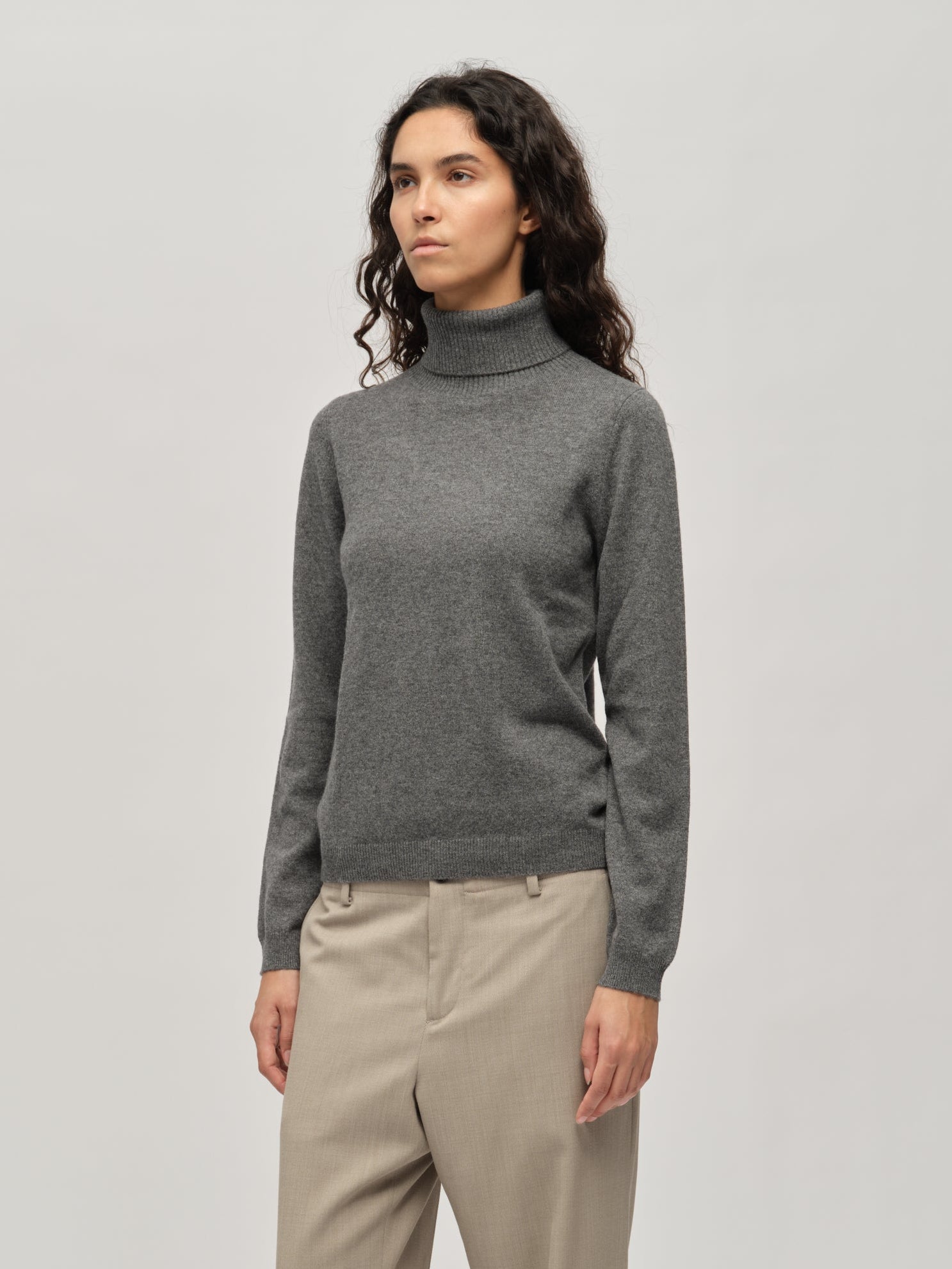 Crafted from 100% Grade A Inner Mongolian cashmere in a 12-gauge knit, this Women’s Turtleneck sweater in Heather Grey offers timeless luxury and exceptional comfort. Featuring a slim fit and a snug, high turtleneck, it’s perfect for layering or wearing alone. Expertly knitted to resist pilling and maintain its shape, this sweater is a lasting wardrobe essential.