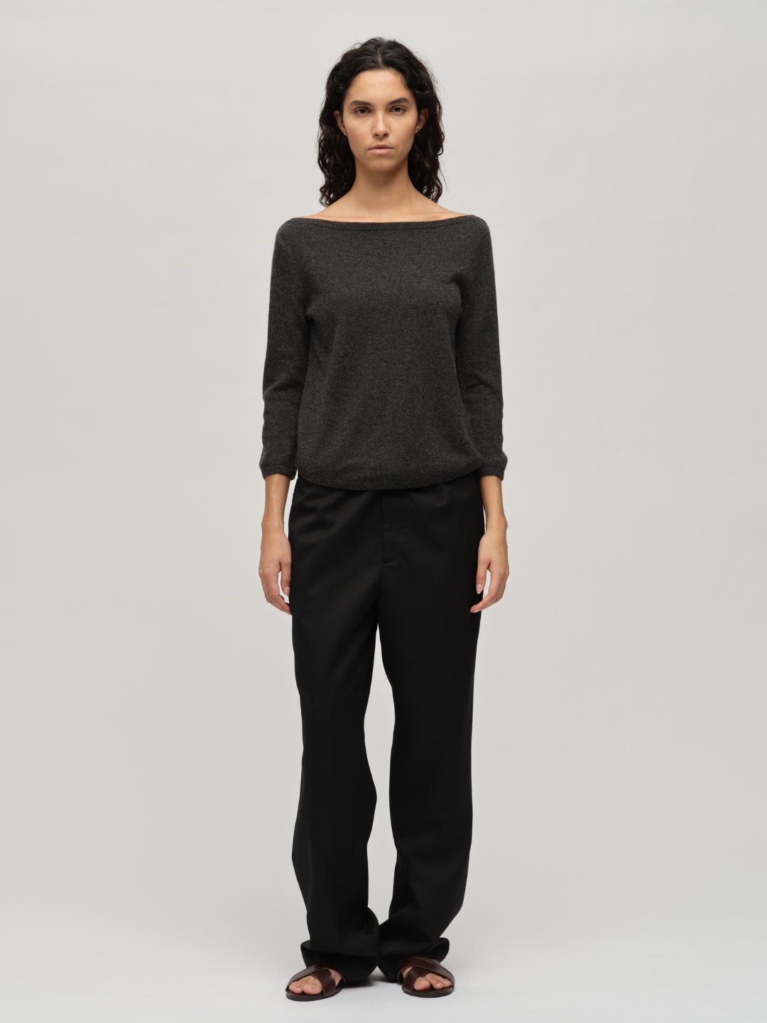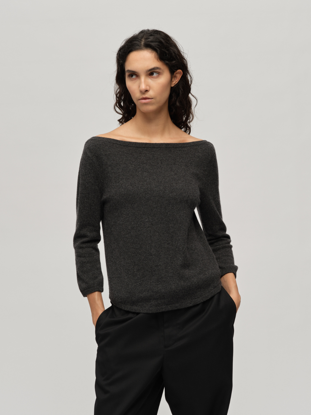 Crafted from 100% cashmere, 10-gauge knit, the Women’s Boat Neck in Dark Grey combines luxurious softness with a lightweight, refined texture. Its classic boat neckline frames the collarbone, adding a touch of effortless elegance to any look. Cut in a regular fit, it balances timeless elegance with everyday comfort, making it a versatile wardrobe essential.