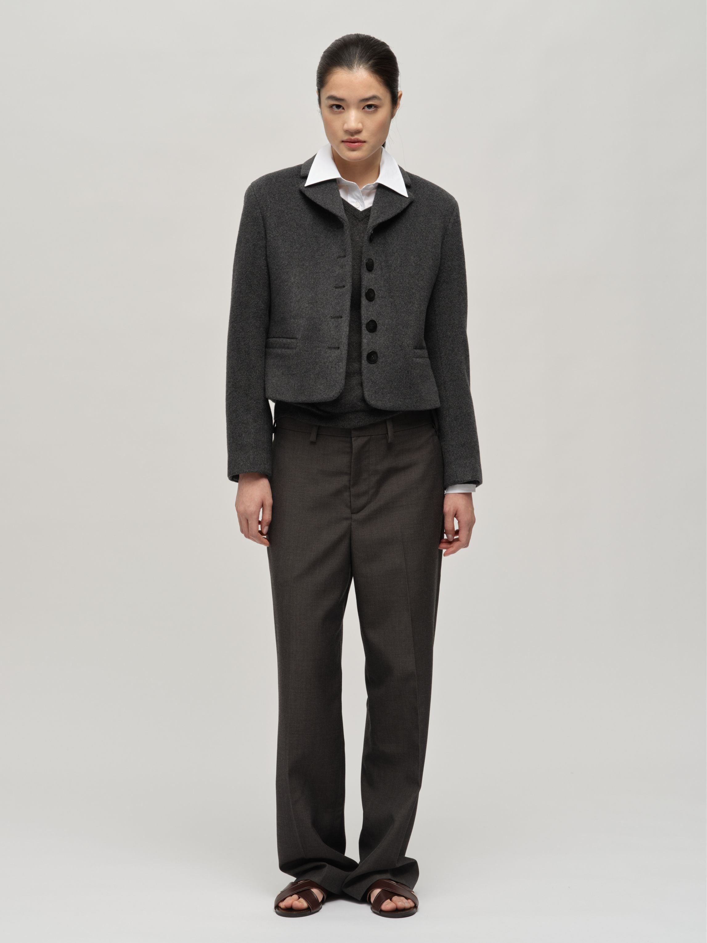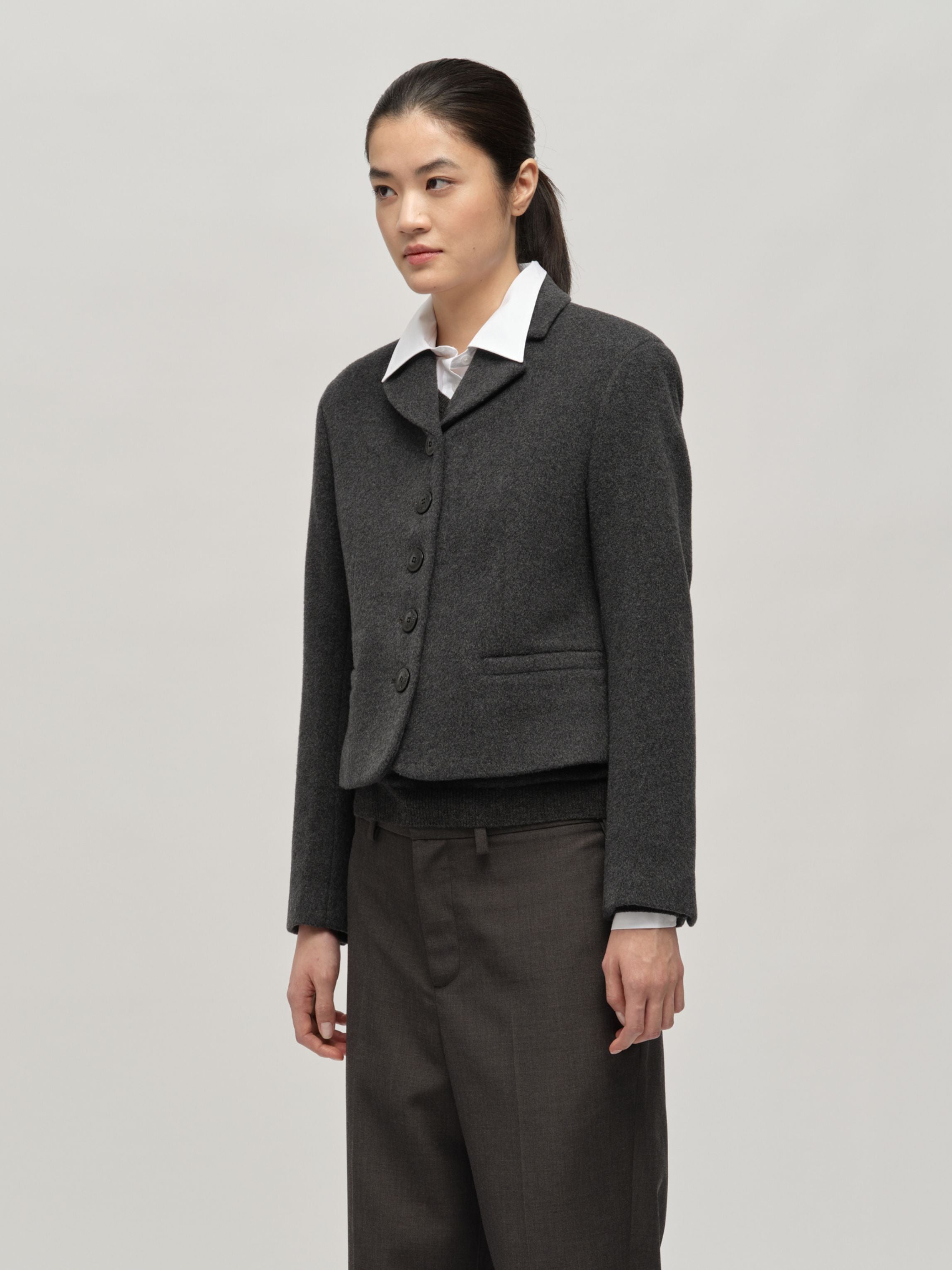Crafted from a luxurious 650g single-face blend of 90% wool and 10% cashmere, the Women’s Short Blazer in Heather Grey combines structure with subtle softness. Tailored for a flattering fit, it features a four-button front closure for a polished, classic finish. Its versatile design ensures effortless wear throughout the seasons.