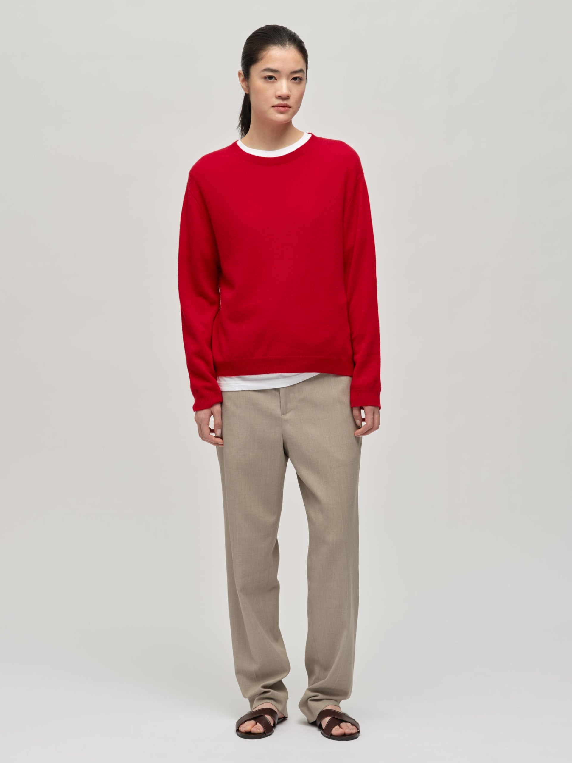 Crafted from 100% Grade A Inner Mongolian cashmere in a 10-gauge knit, the Women's Oversized Roundneck sweater in Red combines timeless luxury with effortless comfort. Featuring a flattering neckline and relaxed boxy silhouette, it’s designed for versatile layering or standalone wear. Expertly knitted to resist pilling and maintain its shape, this piece is a lasting investment for any wardrobe.