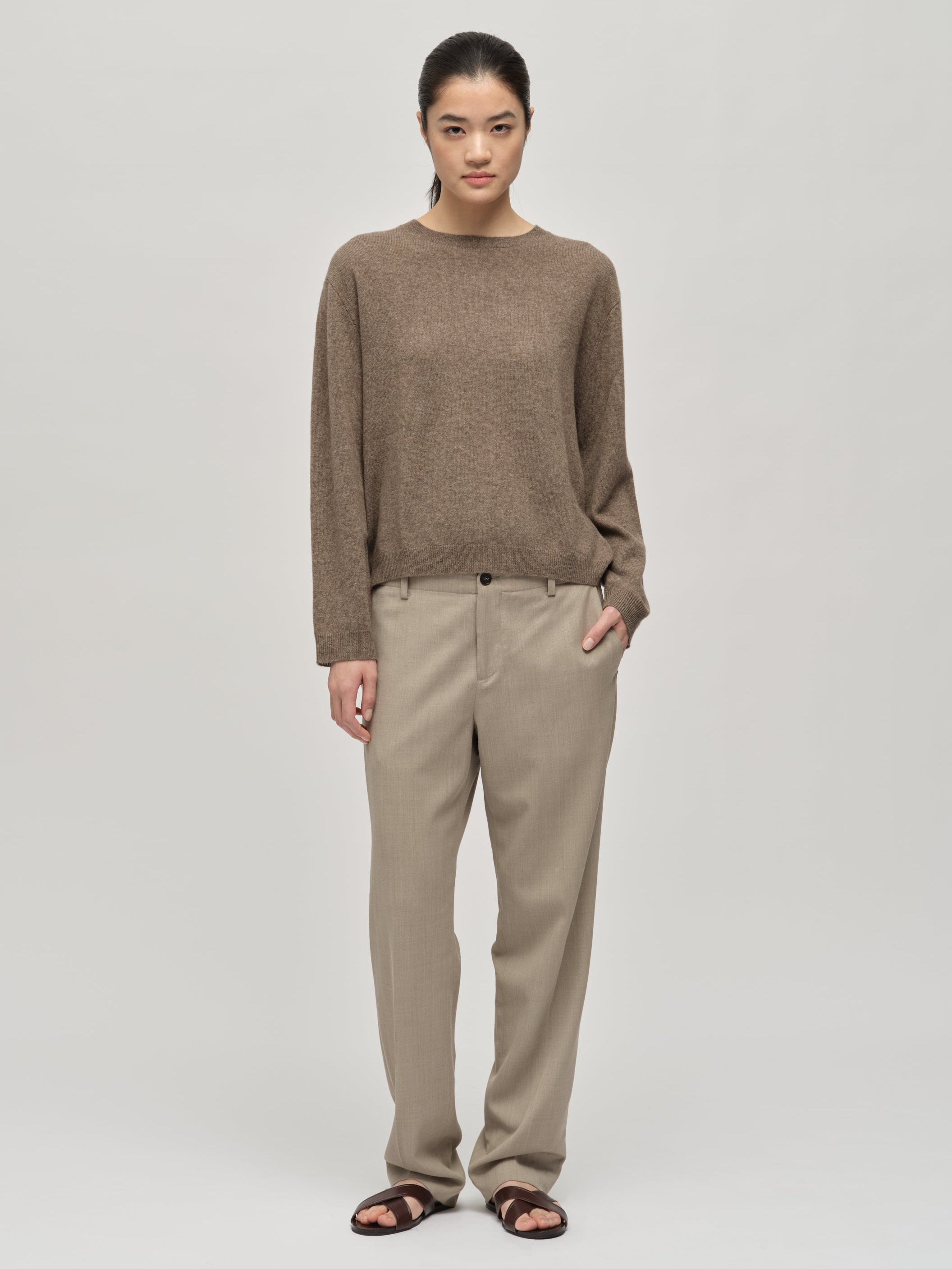Crafted from 100% Grade A Inner Mongolian cashmere in a 10-gauge knit, the Women's Oversized Roundneck sweater in Truffle combines timeless luxury with effortless comfort. Featuring a flattering neckline and relaxed boxy silhouette, it’s designed for versatile layering or standalone wear. Expertly knitted to resist pilling and maintain its shape, this piece is a lasting investment for any wardrobe.