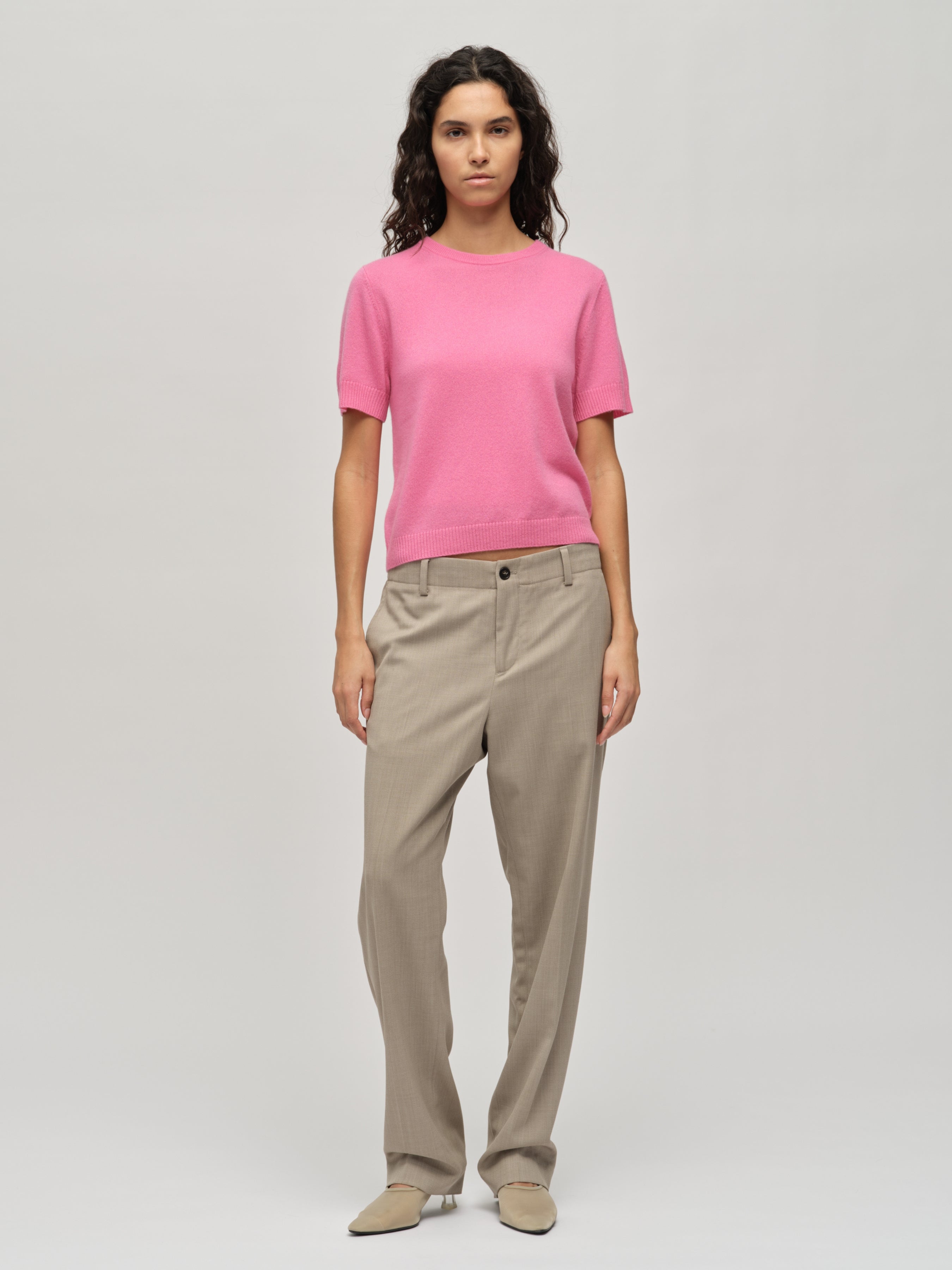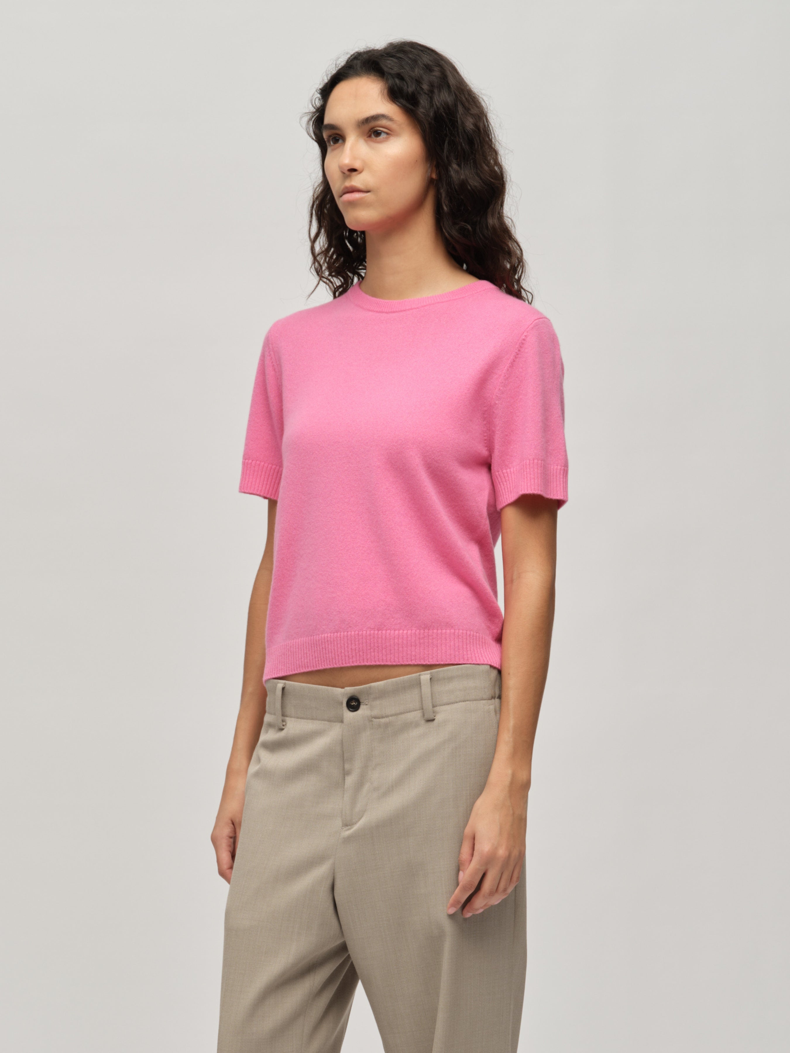 Knitted in 12-gauge cashmere, the Women's Blouse in Pink is crafted from 100% Grade A Inner Mongolian cashmere for exceptional softness and durability. Featuring a laid-back, cropped, and boxy silhouette, this blouse offers a relaxed yet sophisticated look. The short sleeves make it a versatile piece, perfect for year-round wear. Designed to resist pilling and hold its shape, it’s a timeless addition to any wardrobe, combining effortless style with premium quality.