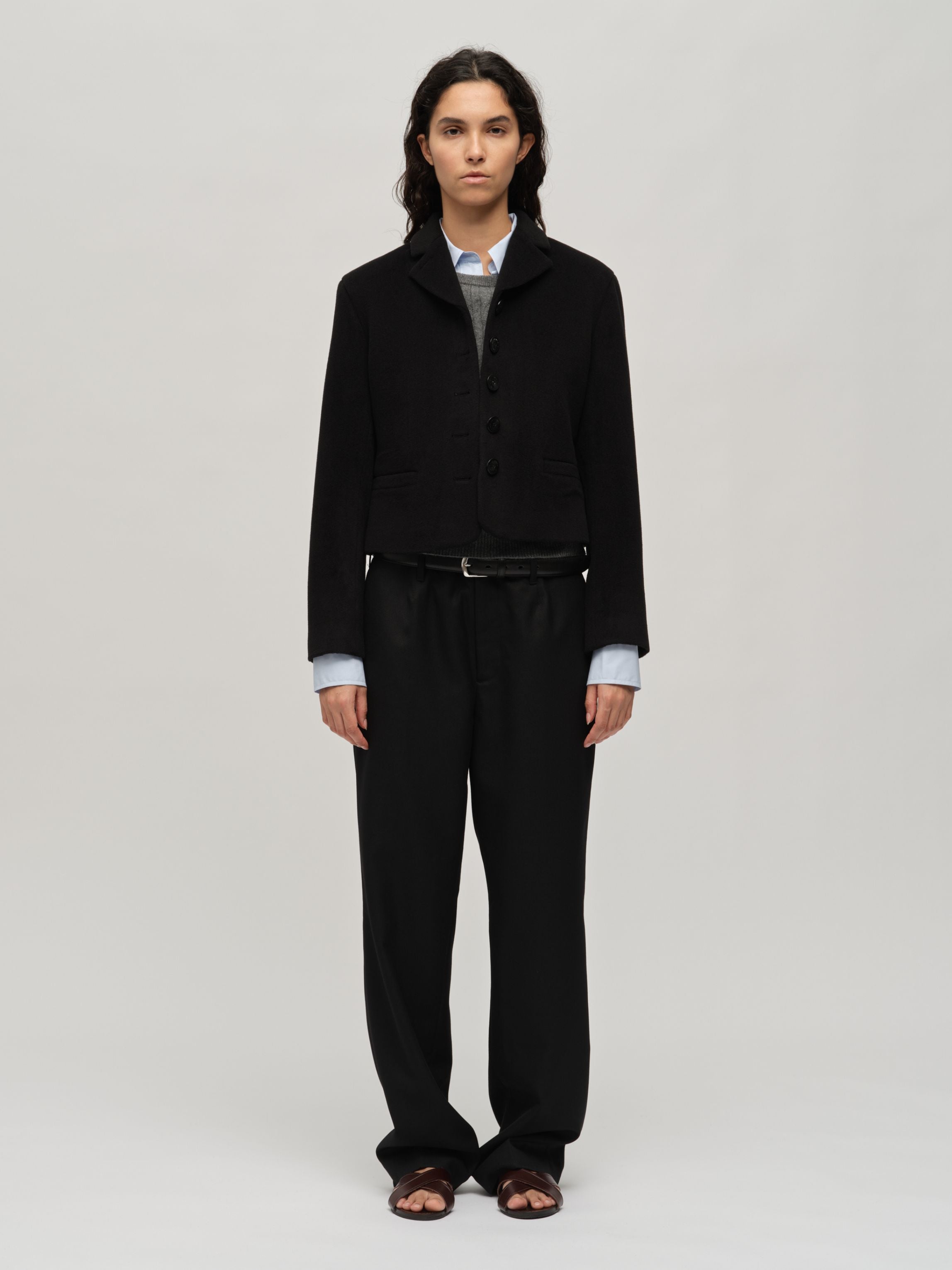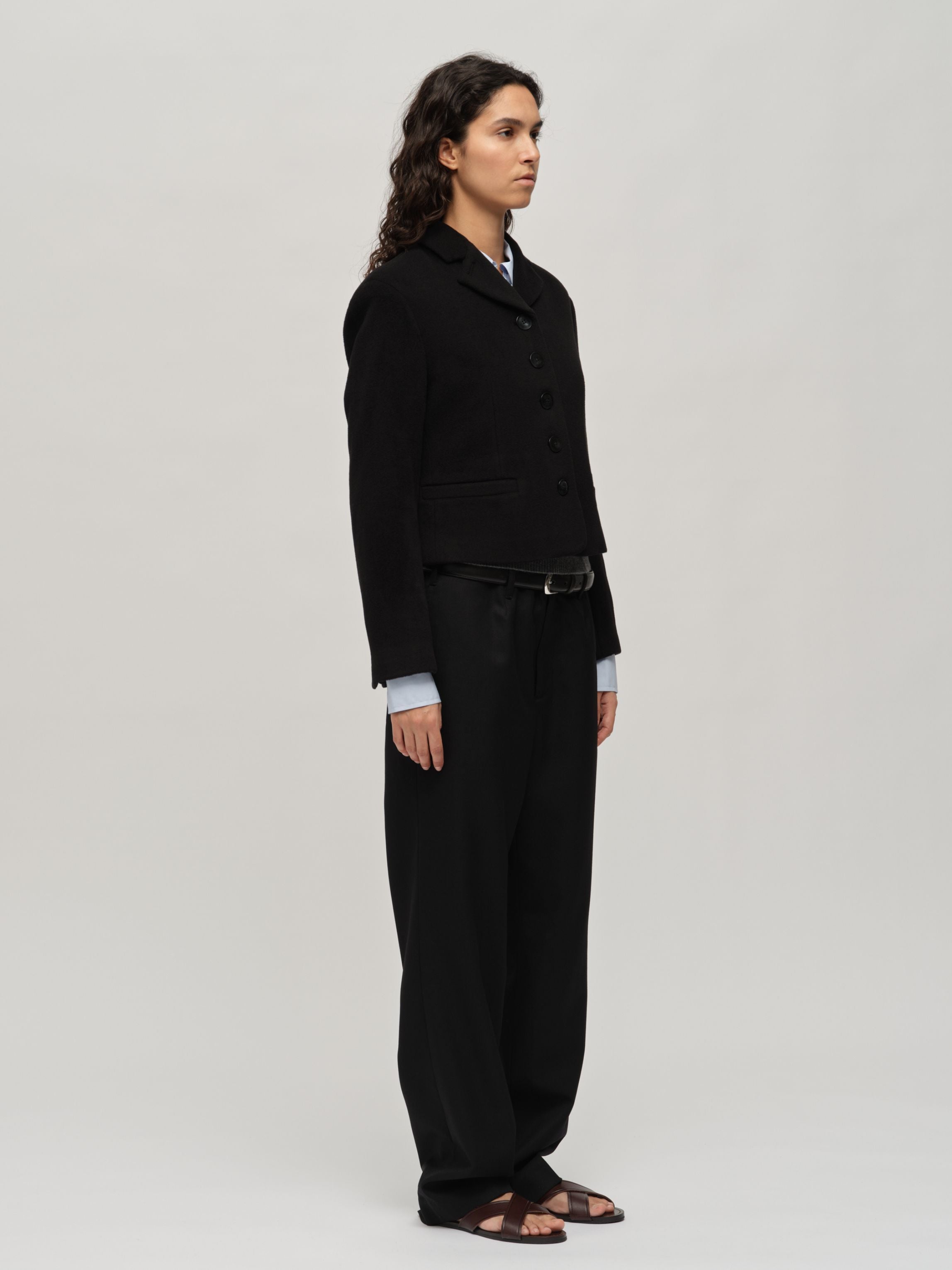 Crafted from a luxurious 650g single-face blend of 90% wool and 10% cashmere, the Women’s Short Blazer in Black combines structure with subtle softness. Tailored for a flattering fit, it features a four-button front closure for a polished, classic finish. Its versatile design ensures effortless wear throughout the seasons.