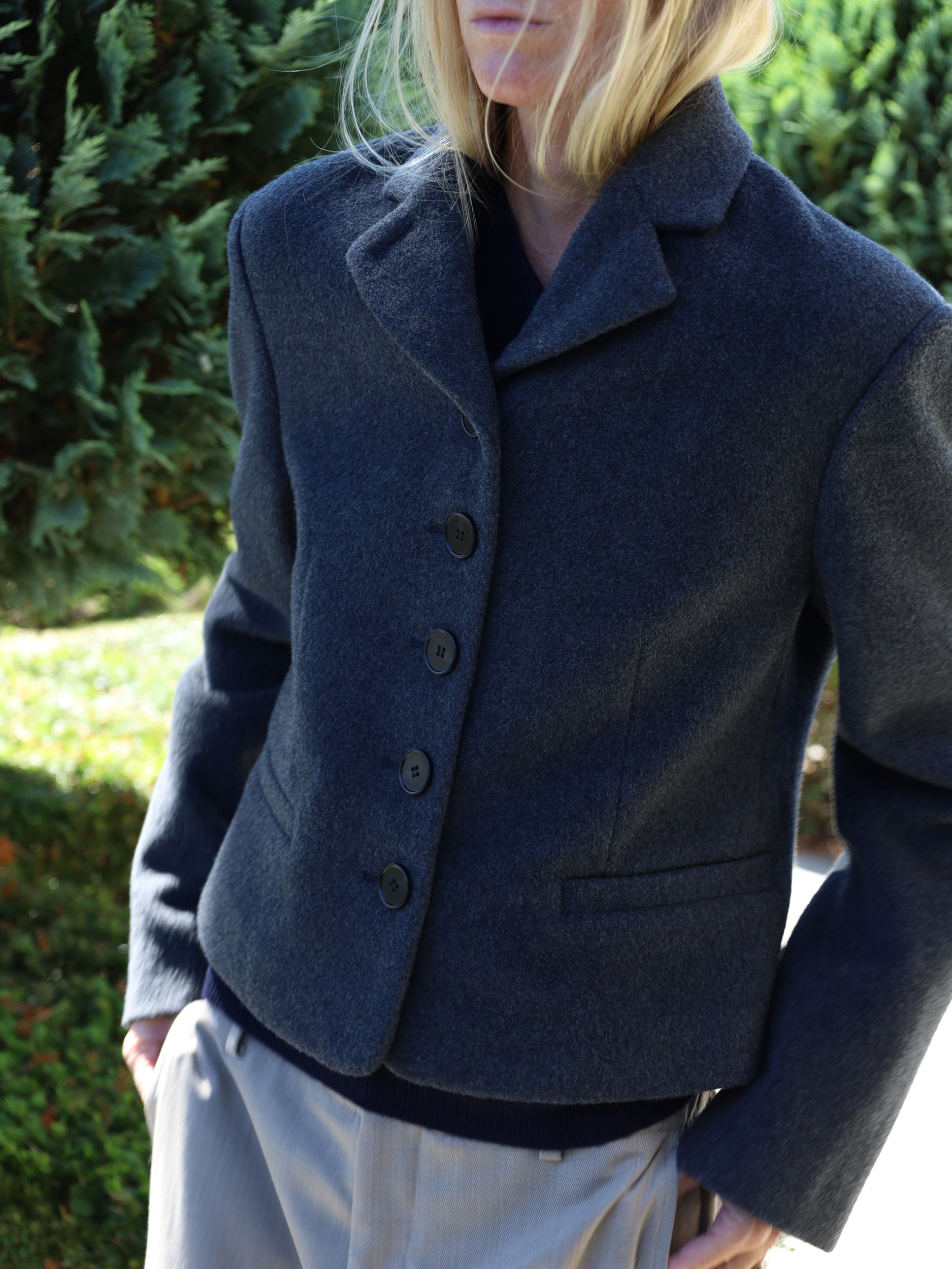Crafted from a luxurious 650g single-face blend of 90% wool and 10% cashmere, the Women’s Short Blazer in Heather Grey combines structure with subtle softness. Tailored for a flattering fit, it features a four-button front closure for a polished, classic finish. Its versatile design ensures effortless wear throughout the seasons.