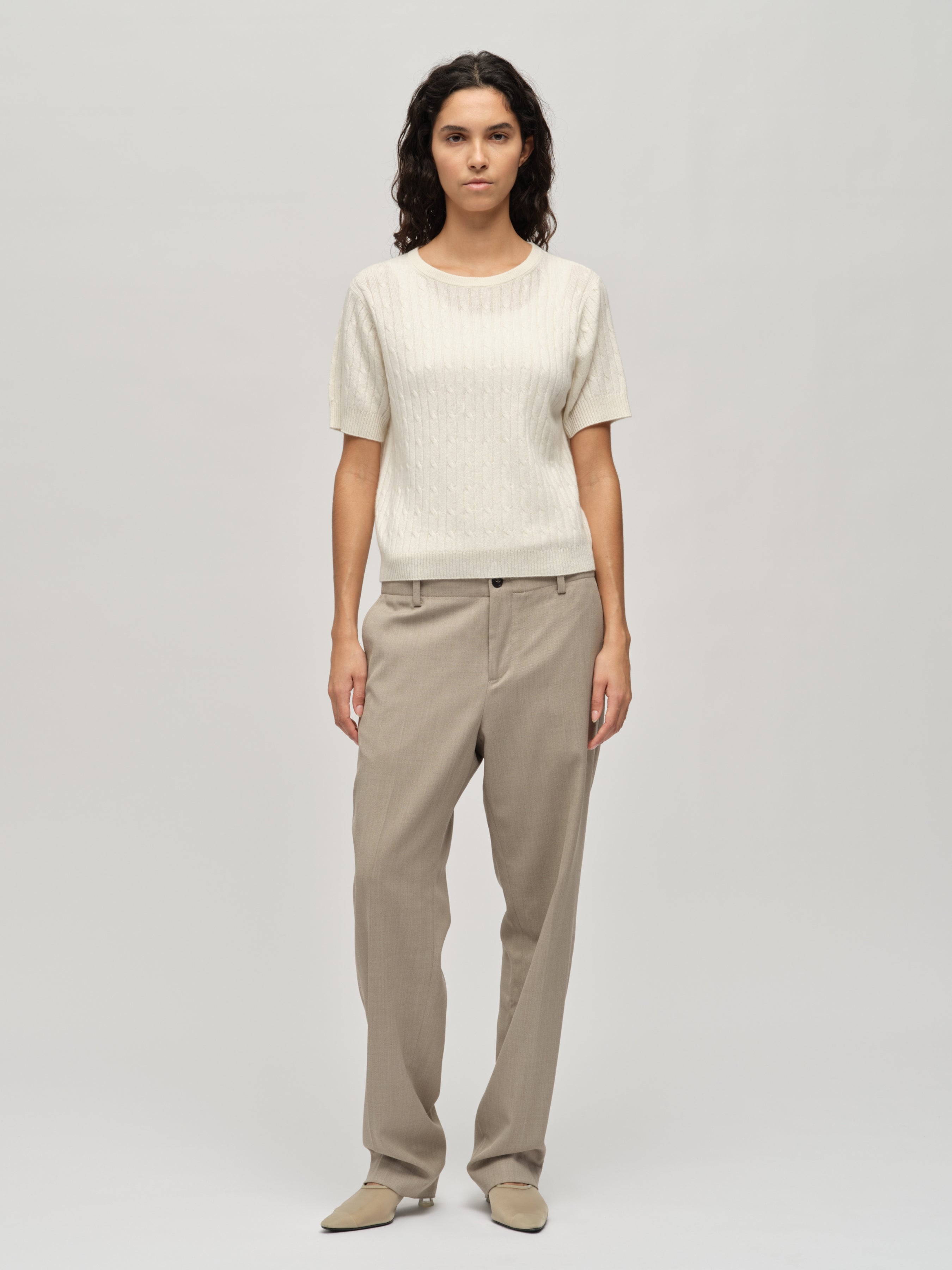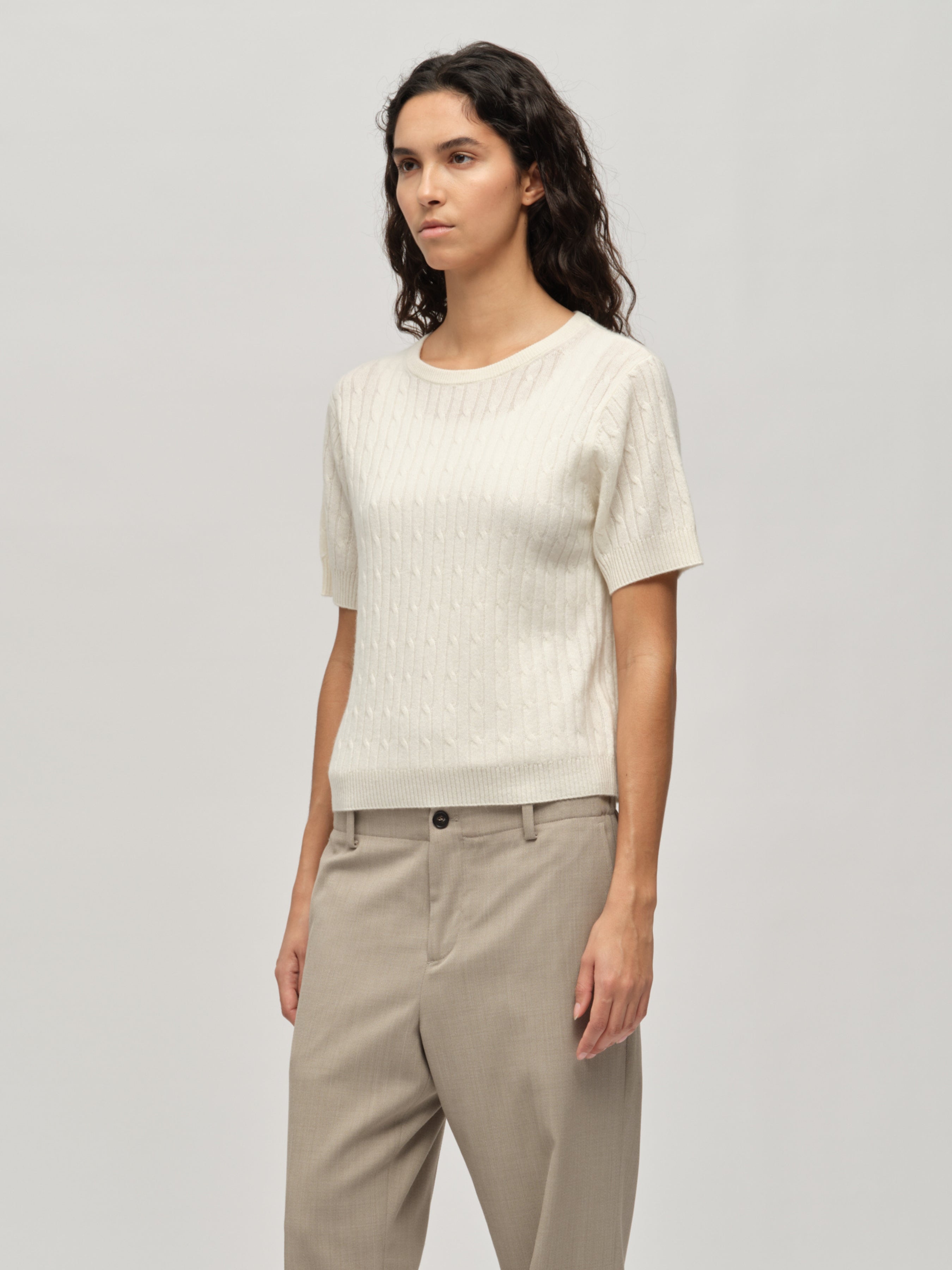 Knitted from 100% Grade A Inner Mongolian cashmere in a 12-gauge construction, the Women’s Cableknit Blouse in Cloud combines exceptional softness with lasting quality. Cut in a regular fit, it features a relaxed, structured silhouette. The cable pattern adds subtle texture, elevating the piece while remaining versatile for year-round wear. Designed to maintain its shape and resist pilling, it is a timeless addition to any wardrobe.