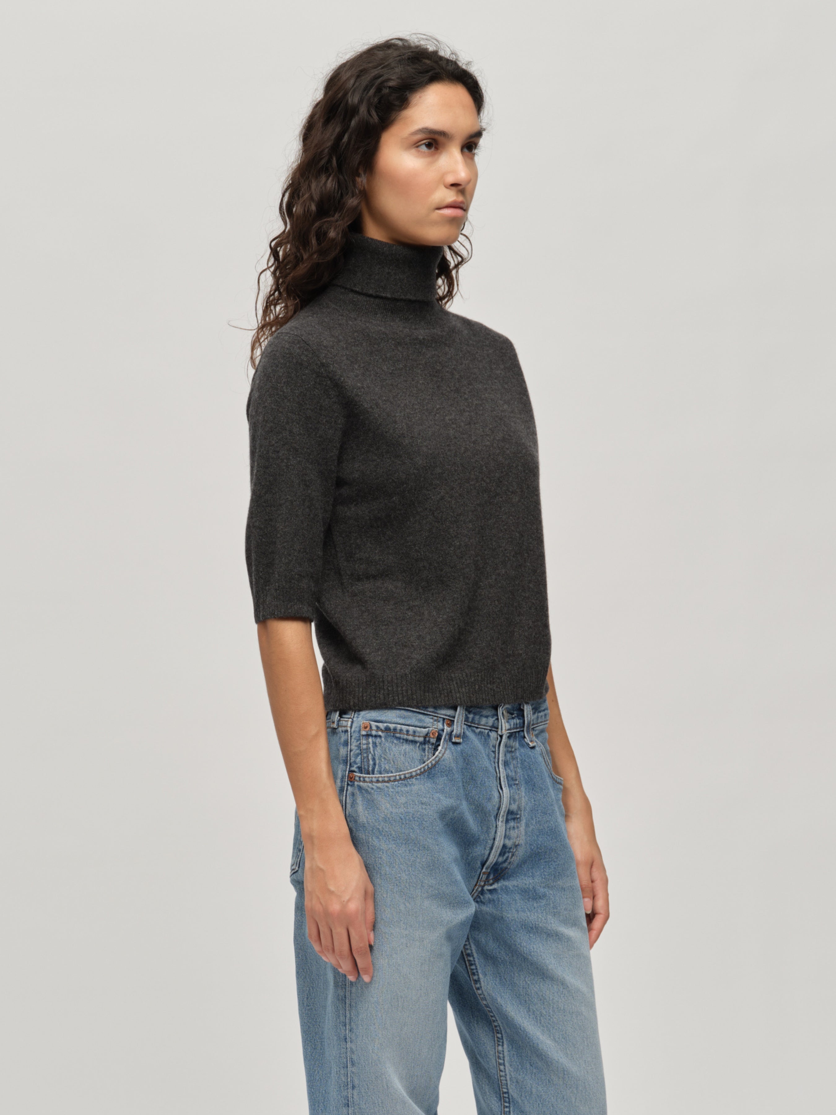 Crafted from 100% Grade A Inner Mongolian cashmere in a 12-gauge knit, the Women's Turtleneck Blouse in Dark Grey features a ribbed turtle neckline and a smooth, soft finish for ultimate comfort. Designed with three-quarter sleeves and a cropped fit, it offers a flattering, feminine silhouette. Lightweight and elegant, this blouse effortlessly elevates any outfit and is a versatile wardrobe essential.