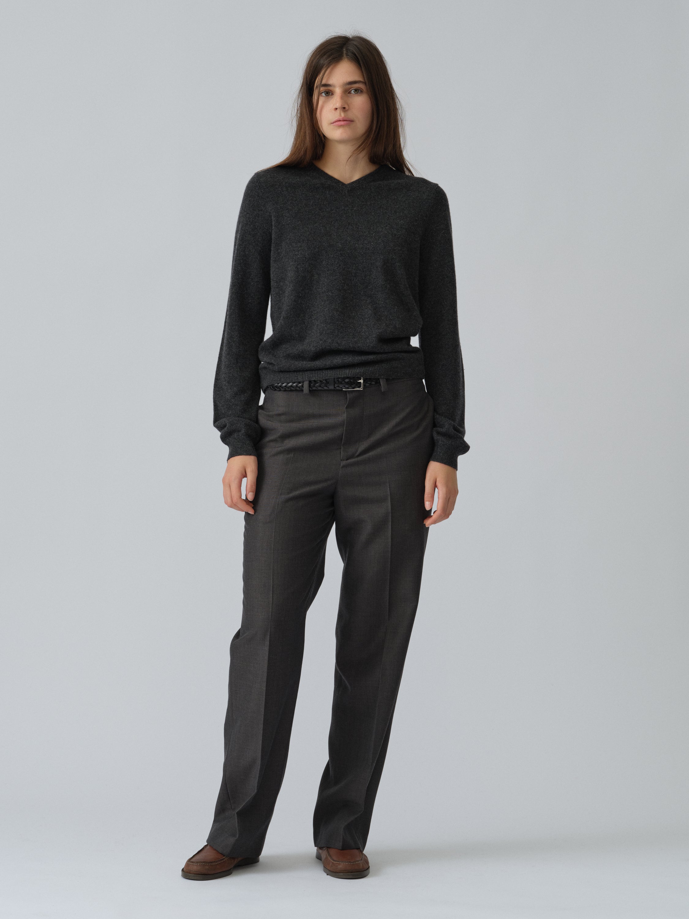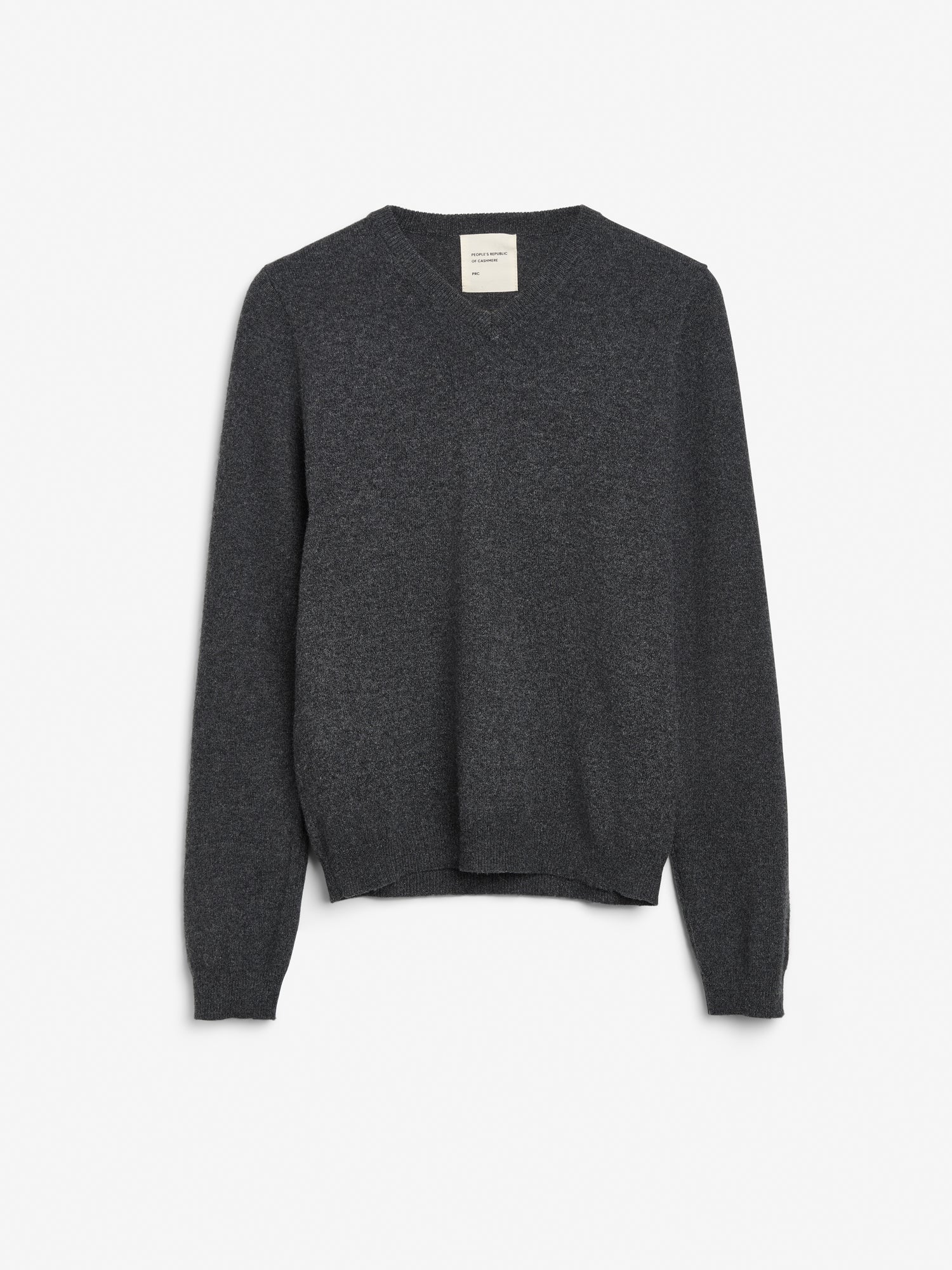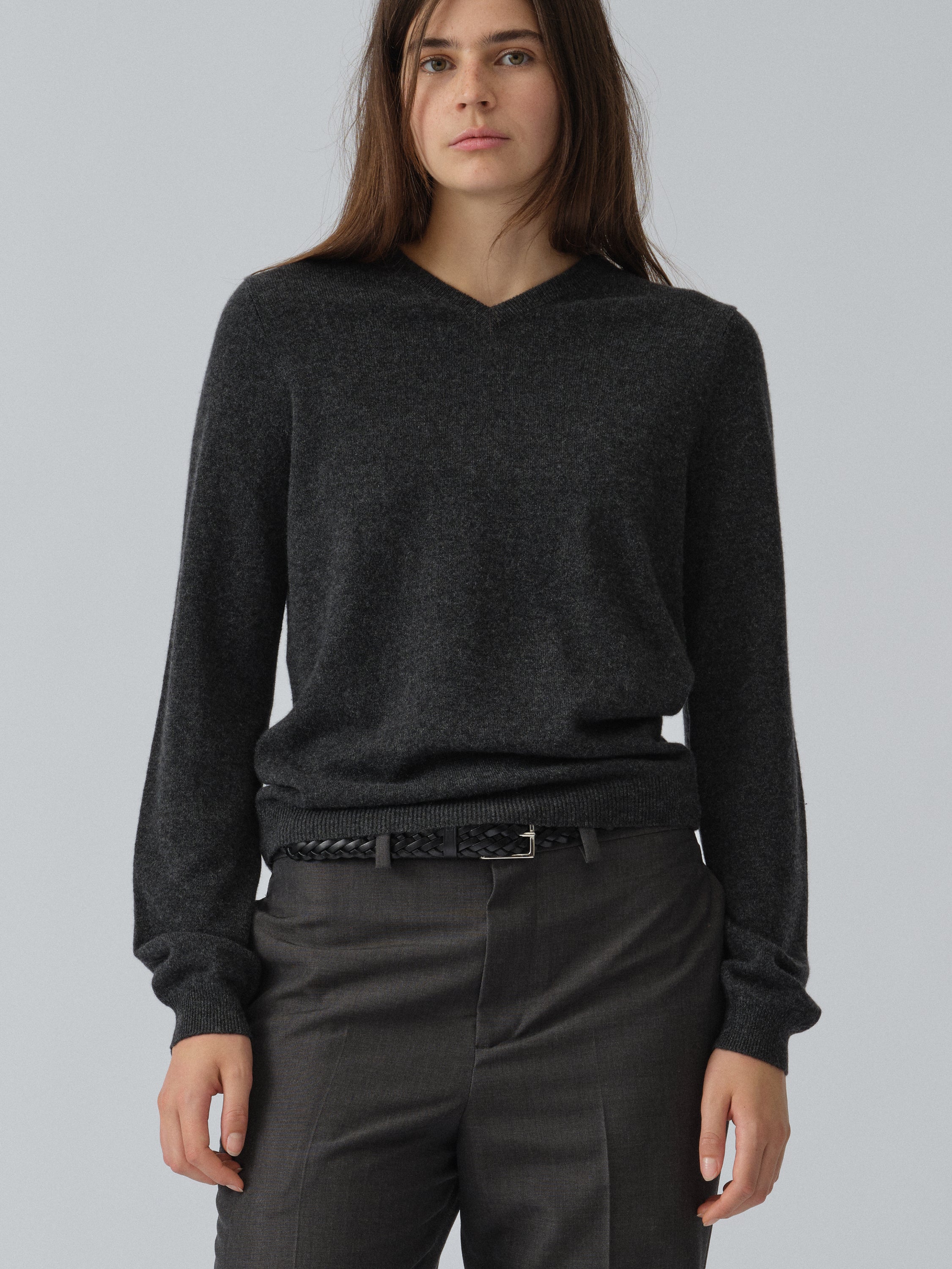Crafted from 100% Grade A cashmere in a 12-gauge knit, the Women's Fitted 90s V-Neck in Dark Grey features a clean V-neckline and a softly contoured silhouette that flatters without feeling tight. Inspired by 90s minimalism, it brings a modern edge to a timeless shape, perfect for layering or wearing on its own. A versatile piece designed for effortless, everyday elegance.