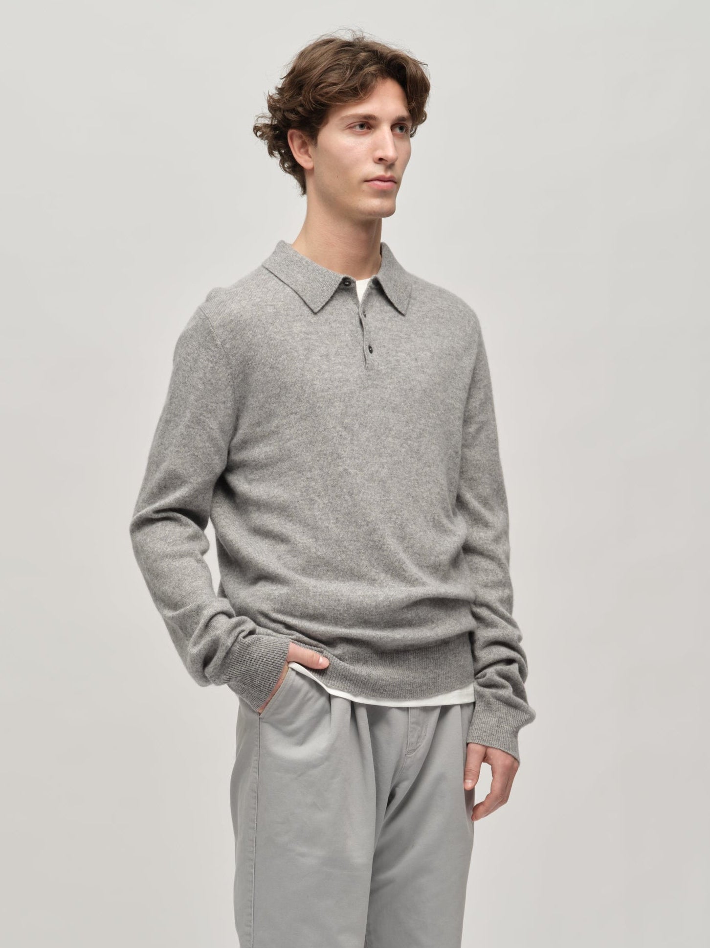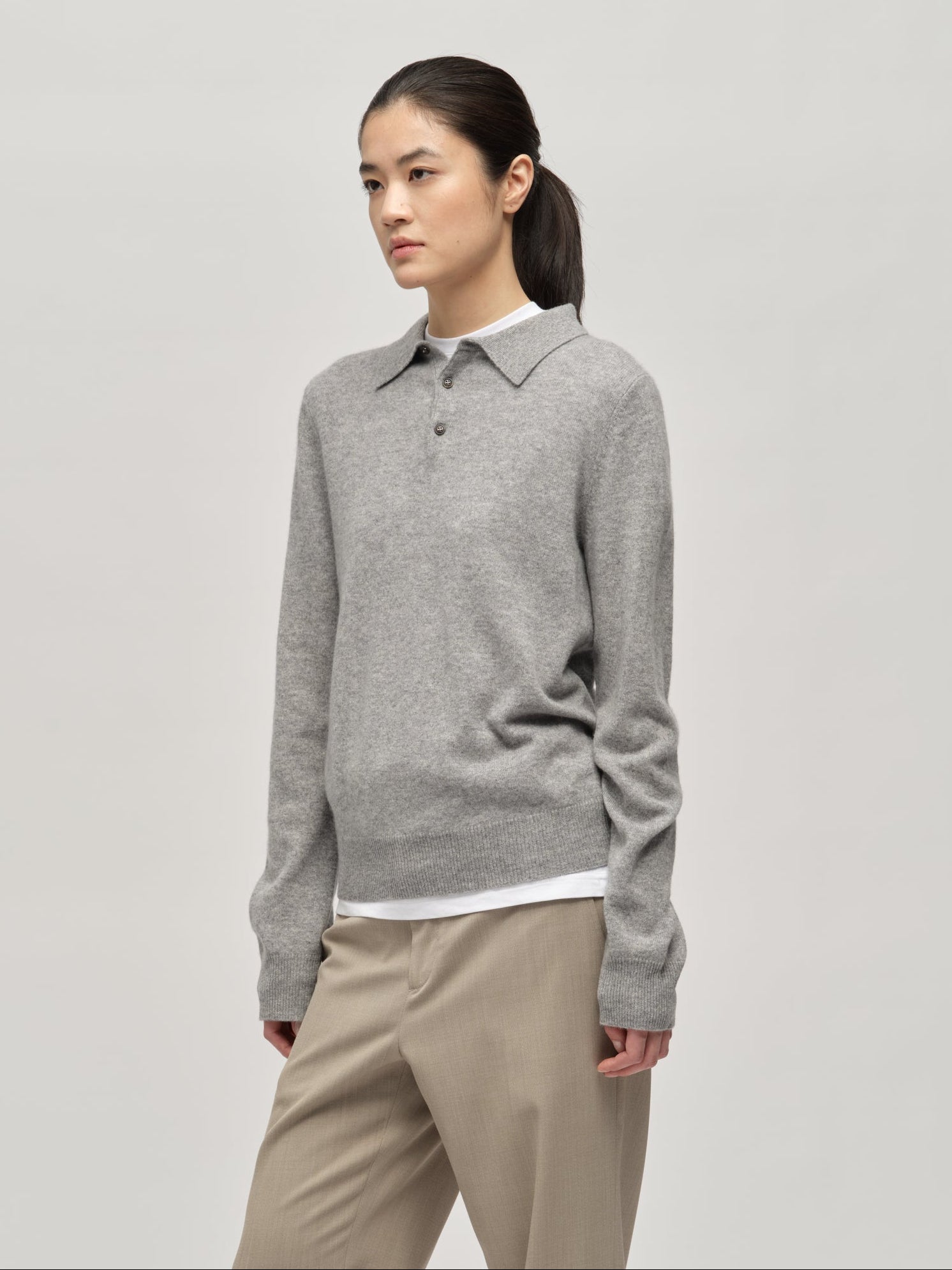 Our Original Polo in Heather Grey Light is made of 100% premium quality cashmere - Inner Mongolian cashmere (Grade A). It features a laid-back and boxy silhouette, giving it a relaxed yet sophisticated look. Tightly knitted to minimize pilling and retain its shape over time, it's a valuable investment for any wardrobe.