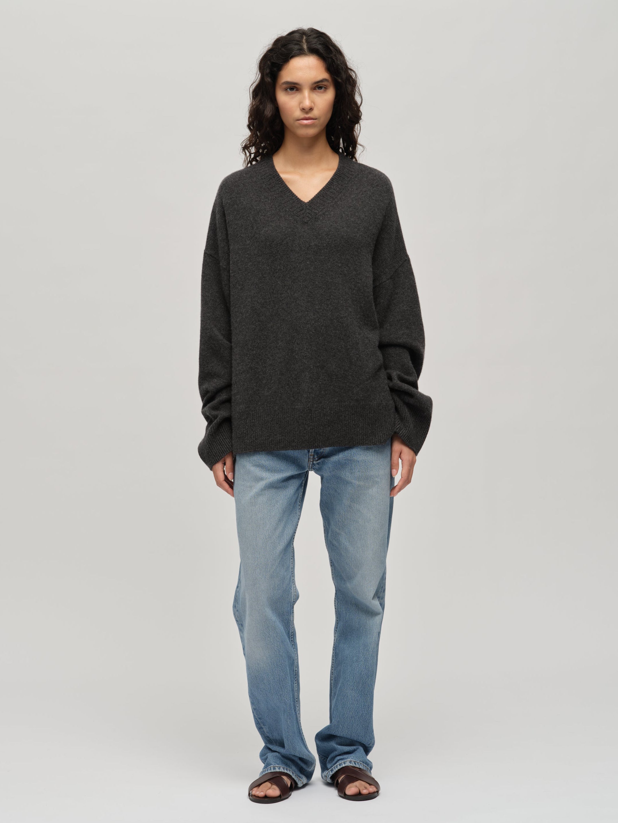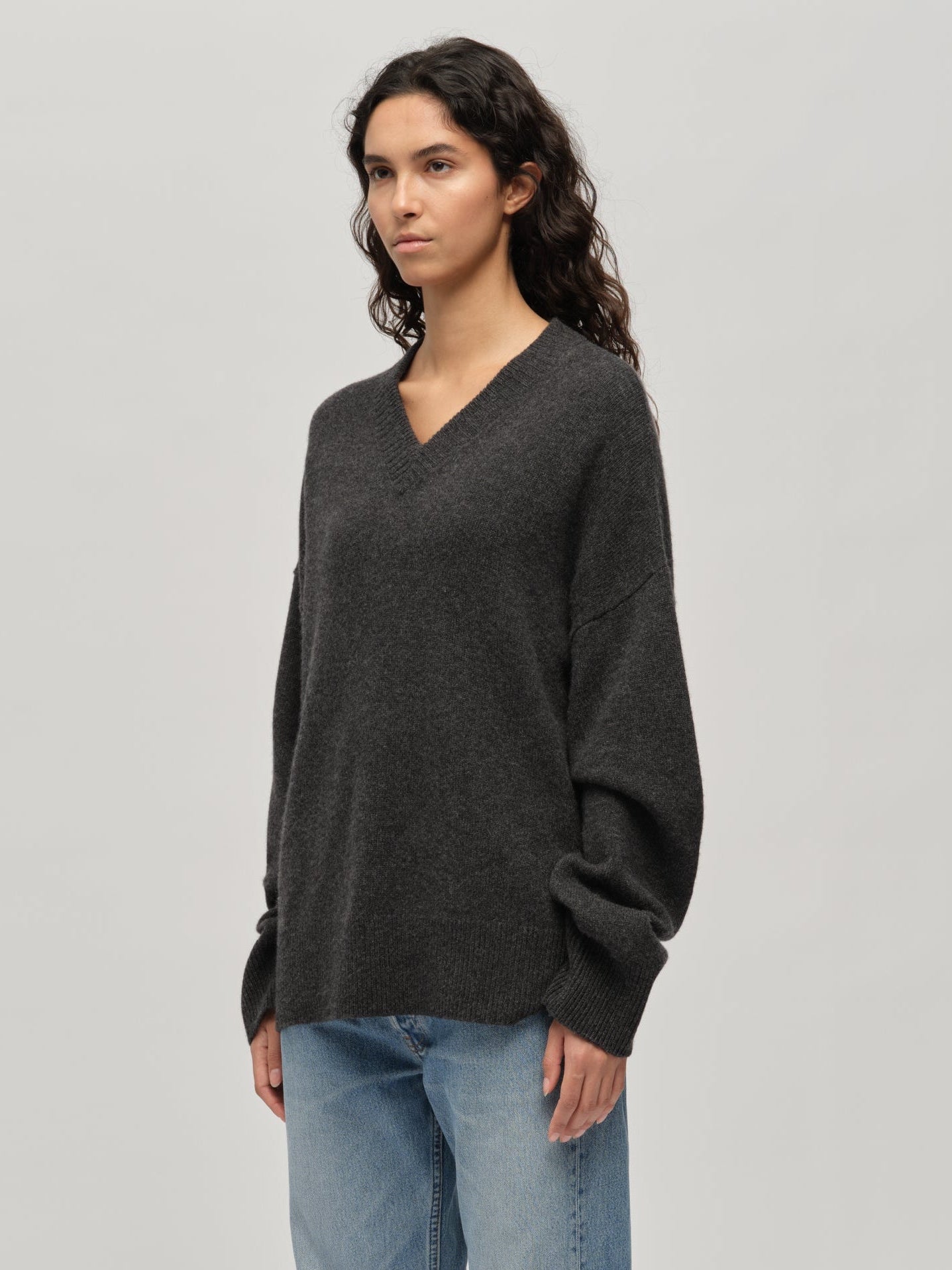 Knitted in 7-gauge cashmere, the Premium V-Neck in Dark Grey is crafted from 100% Grade A Inner Mongolian cashmere for exceptional softness and durability. Designed with a flattering V-shaped neckline, dropped shoulders, and an oversized silhouette, it drapes effortlessly while maintaining a refined shape. Woven to resist pilling and hold its form, this piece offers elegance and lasting comfort, making it a versatile wardrobe piece.