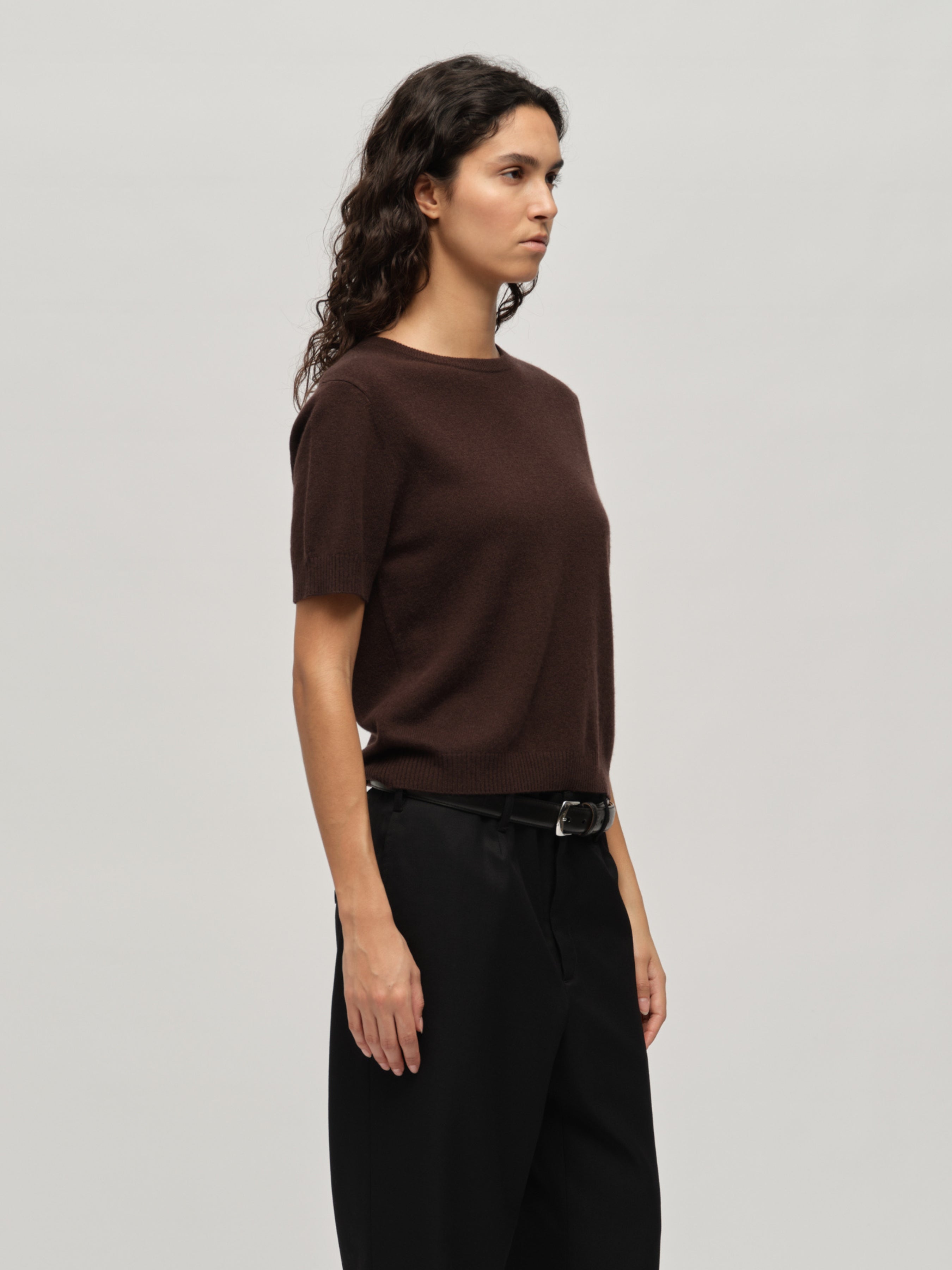 Our Women's Blouse in Dark Brown is made of 100% premium quality cashmere - Inner Mongolian cashmere (Grade A). It features a laid-back, cropped, and boxy silhouette, giving it a relaxed yet sophisticated look, while short sleeves make it perfect for all-year-round wear. Tightly knitted to minimise pilling and retain its shape over time, it's a valuable investment for any wardrobe.