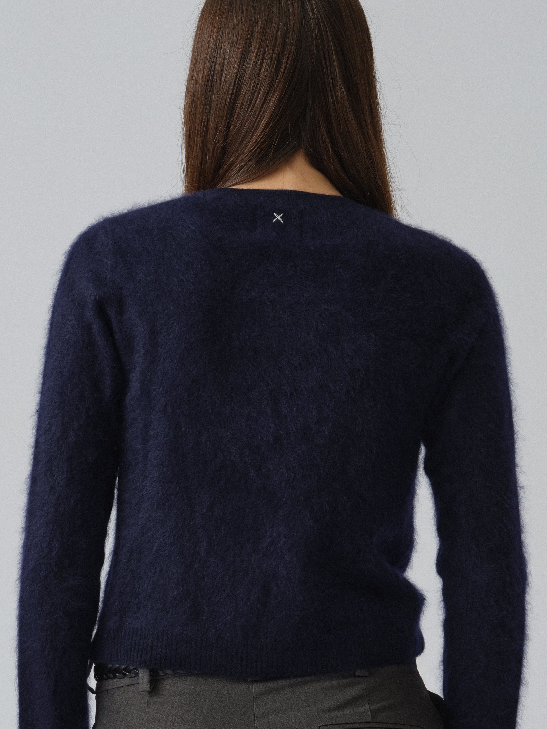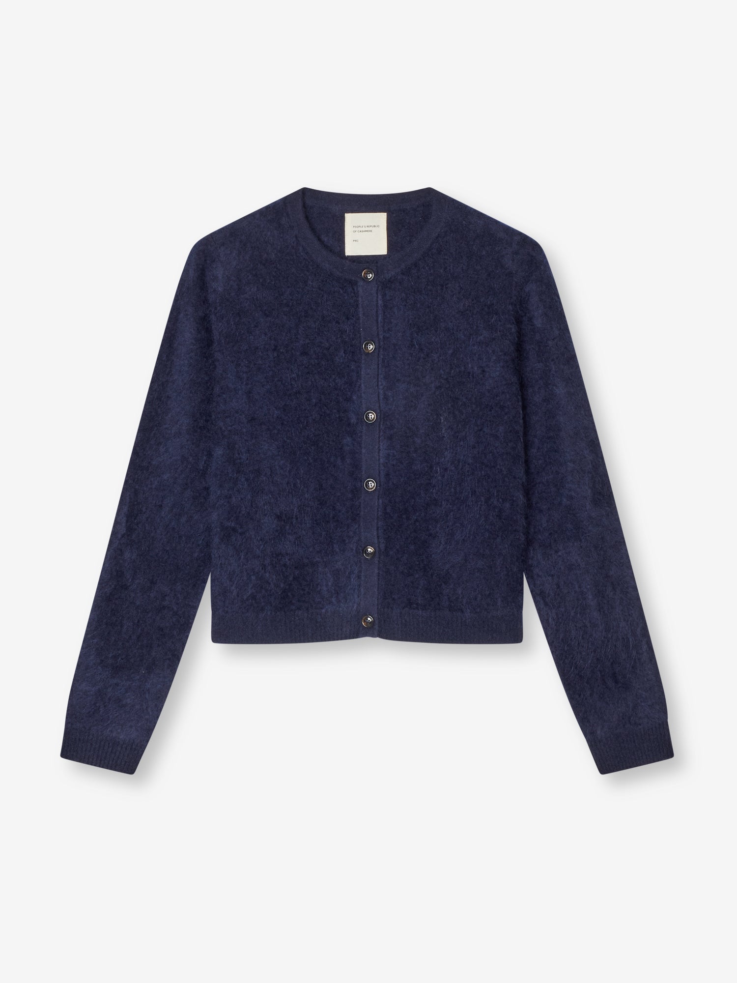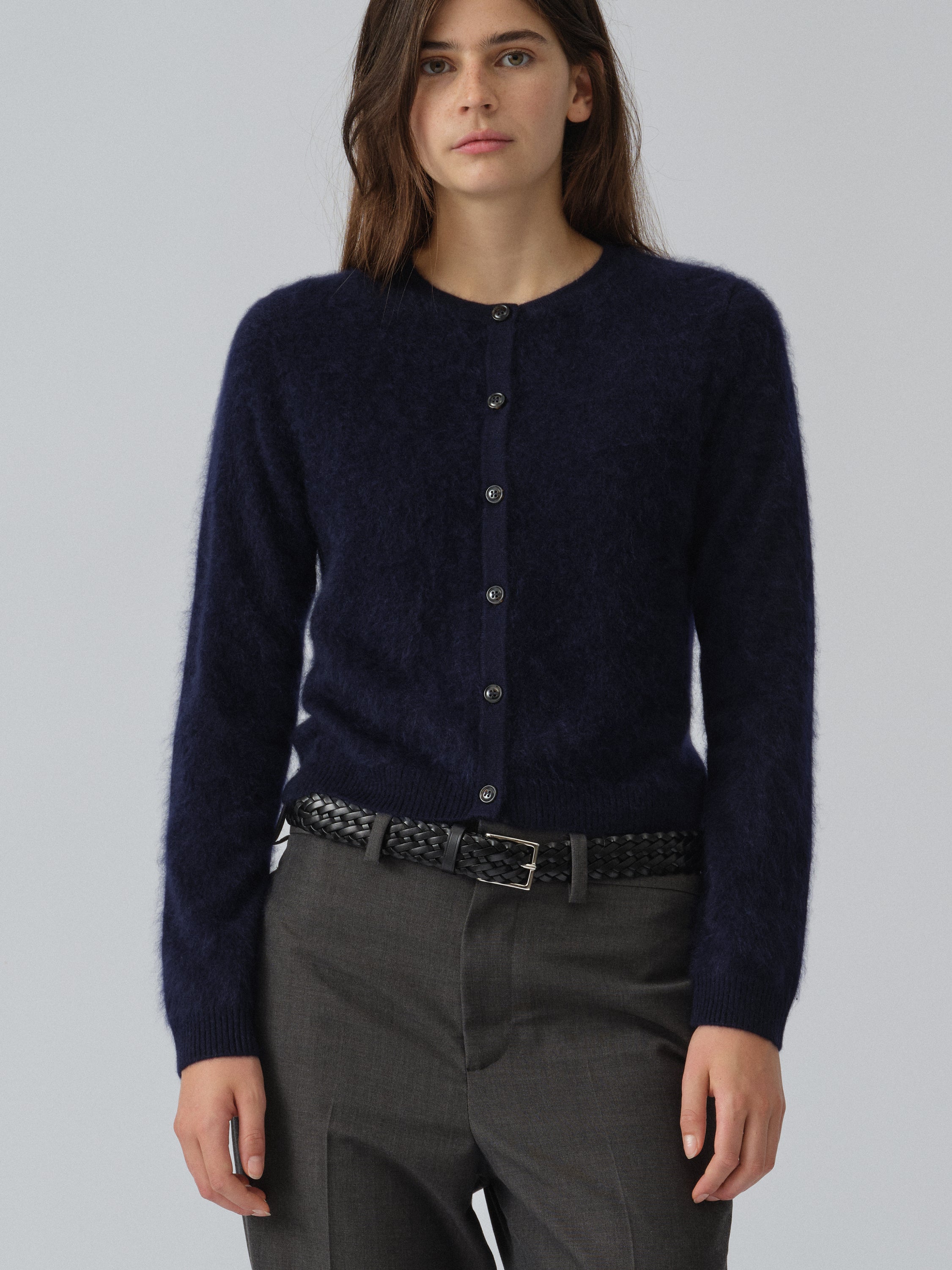 Crafted from 100% Grade A Inner Mongolian cashmere in a 12-gauge knit, the Women’s Brushed O-Cardigan in Navy Blue offers exceptional softness and warmth. The brushed cashmere finish lends a luxuriously plush feel, while the neat round neckline, ribbed trims, and fitted silhouette create a refined, feminine look. Designed to resist pilling and hold its shape, this versatile piece is a timeless essential that combines comfort with understated elegance, season after season.