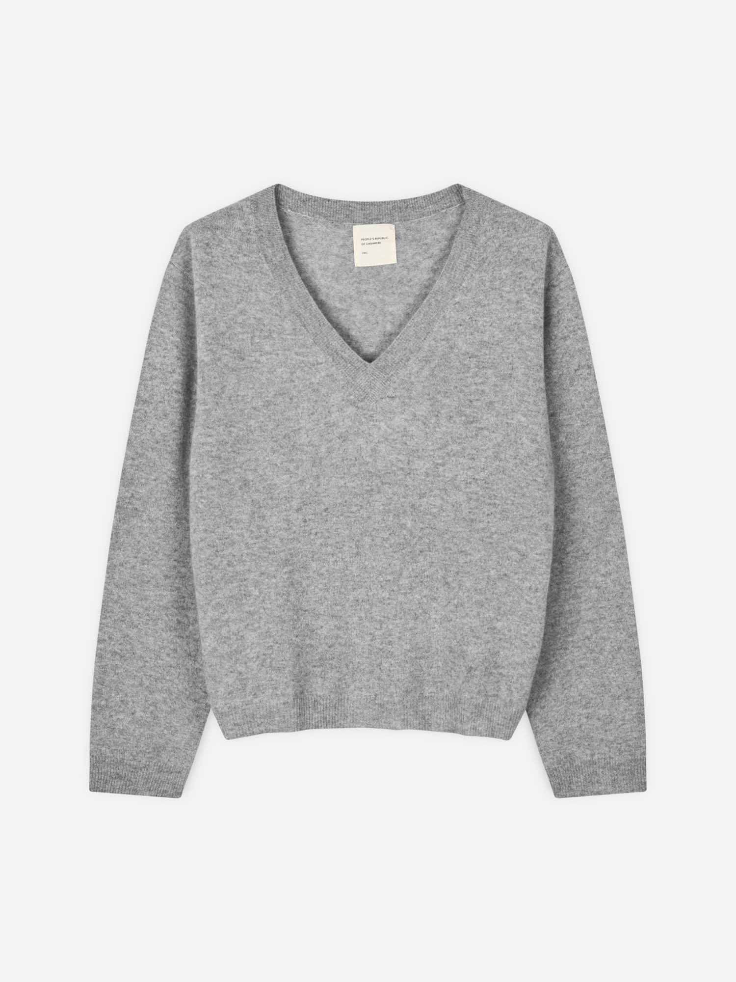 Crafted from 100% Grade A Inner Mongolian cashmere in a 10-gauge knit, the Women's Oversized V-Neck sweater in Heather Grey Light offers timeless luxury and comfort. Featuring a flattering V-shaped neckline and relaxed boxy silhouette, it’s ideal for layering or wearing alone. Expertly knitted to resist pilling and maintain its shape, this versatile piece is a lasting wardrobe essential.